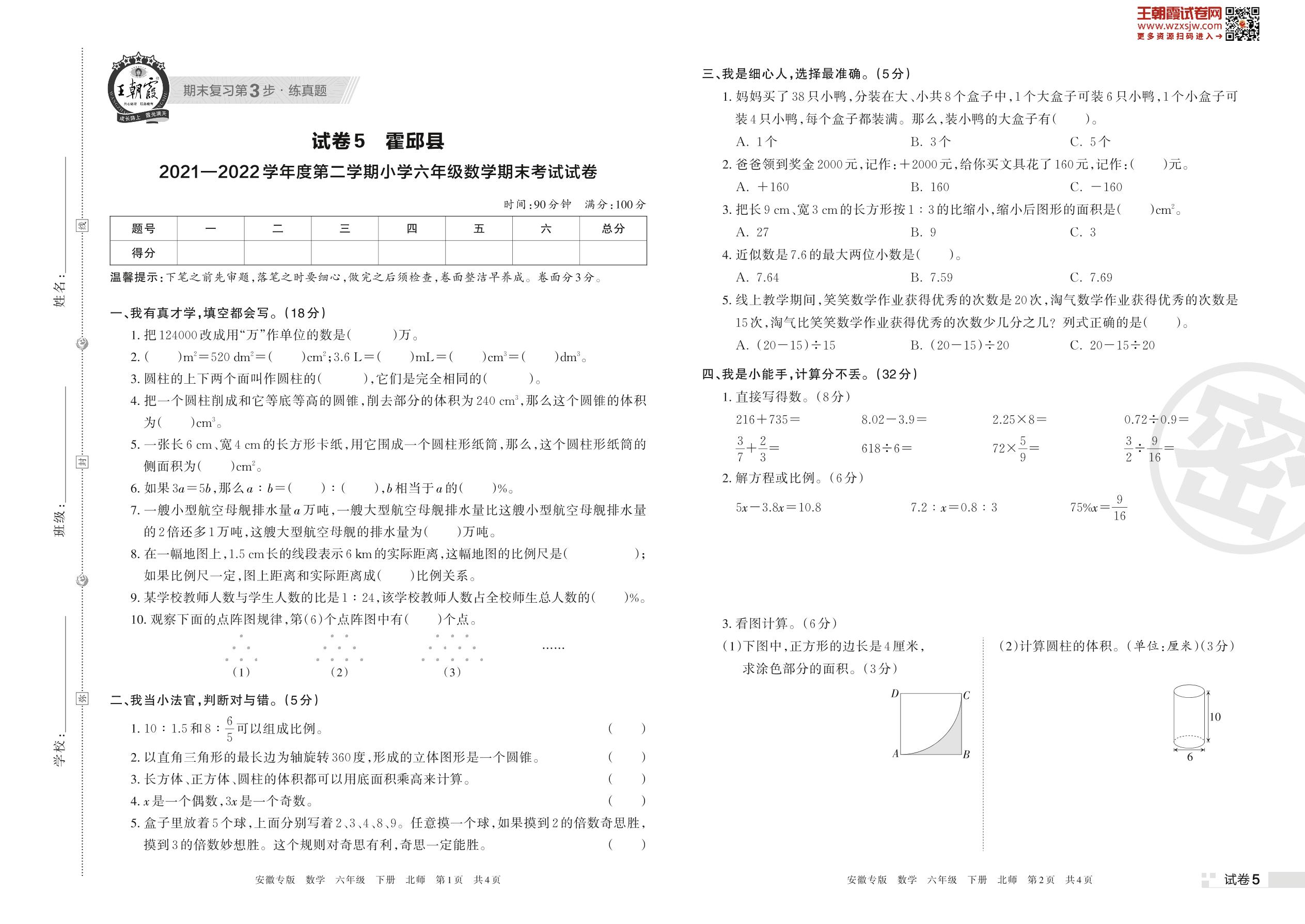 霍邱县2021—2022学年度第二学期小学六年级数学期末考试试卷(北师版)【5】