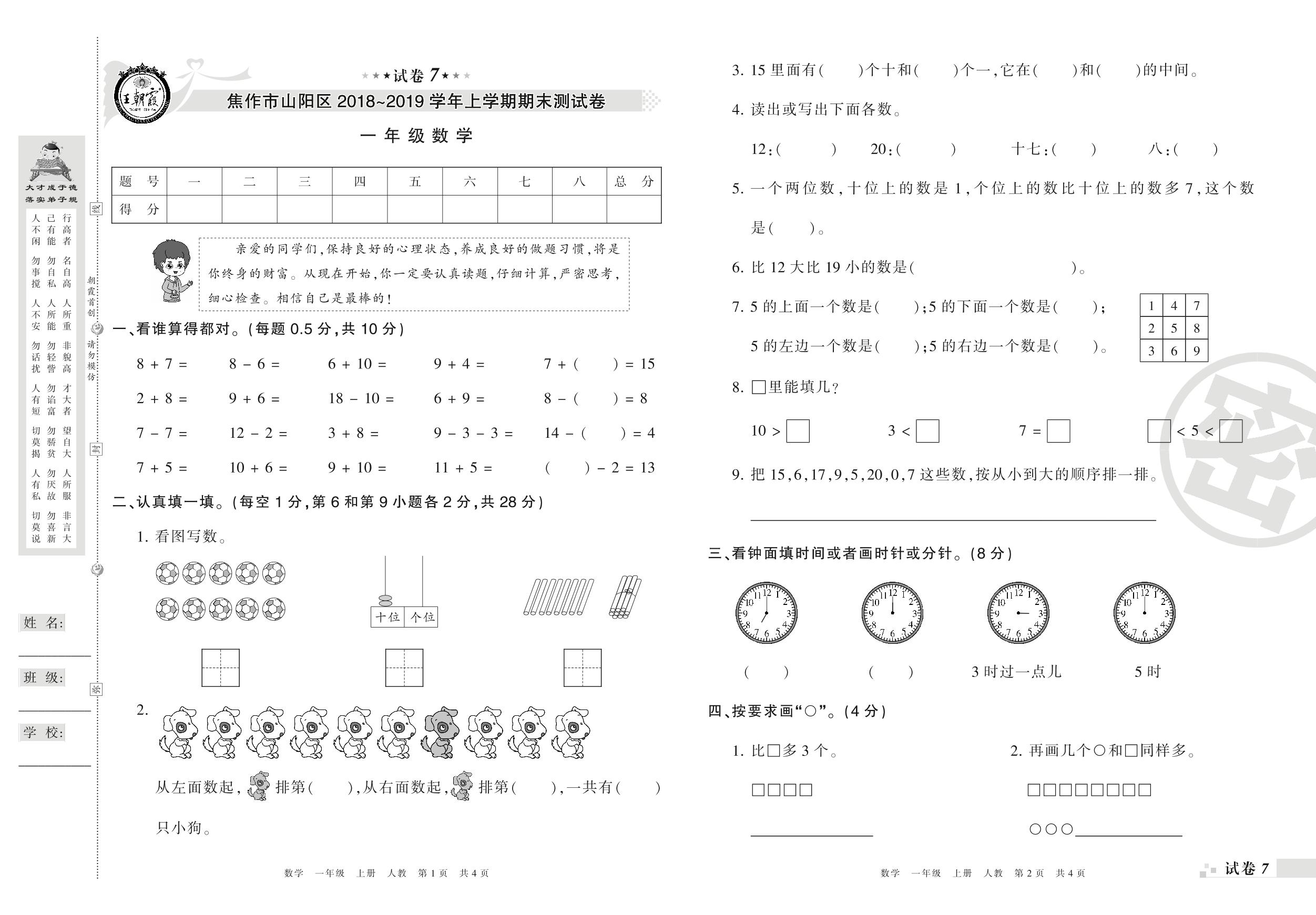 2018-2019学年第一学期焦作市山阳区一年级数学试卷(人教版)【7】