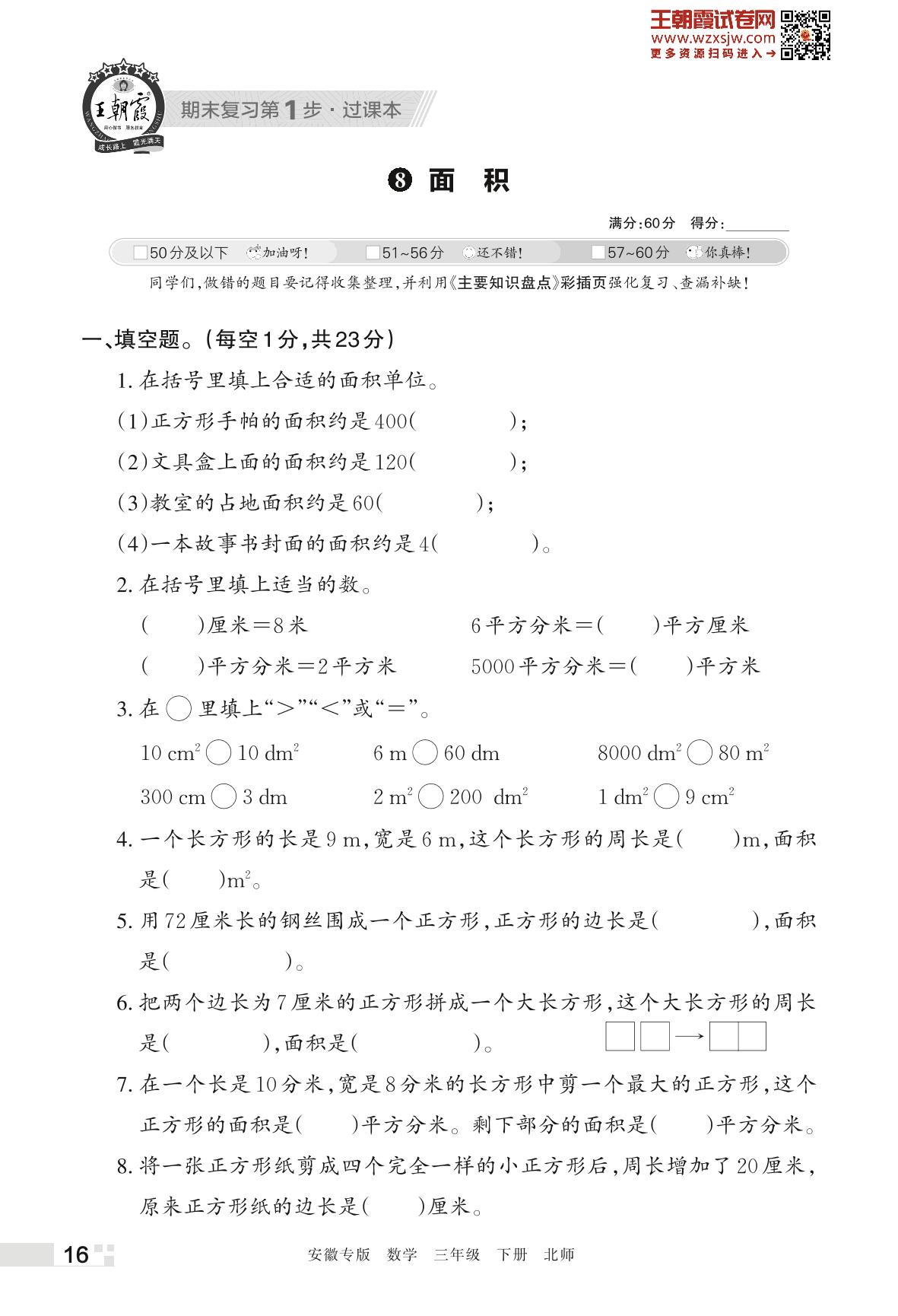 王朝霞期末过课本——8 面积三年级下册数学(北师版)