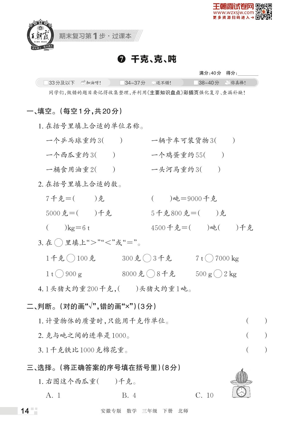 王朝霞期末过课本——7 千克、克吨三年级下册数学(北师版)