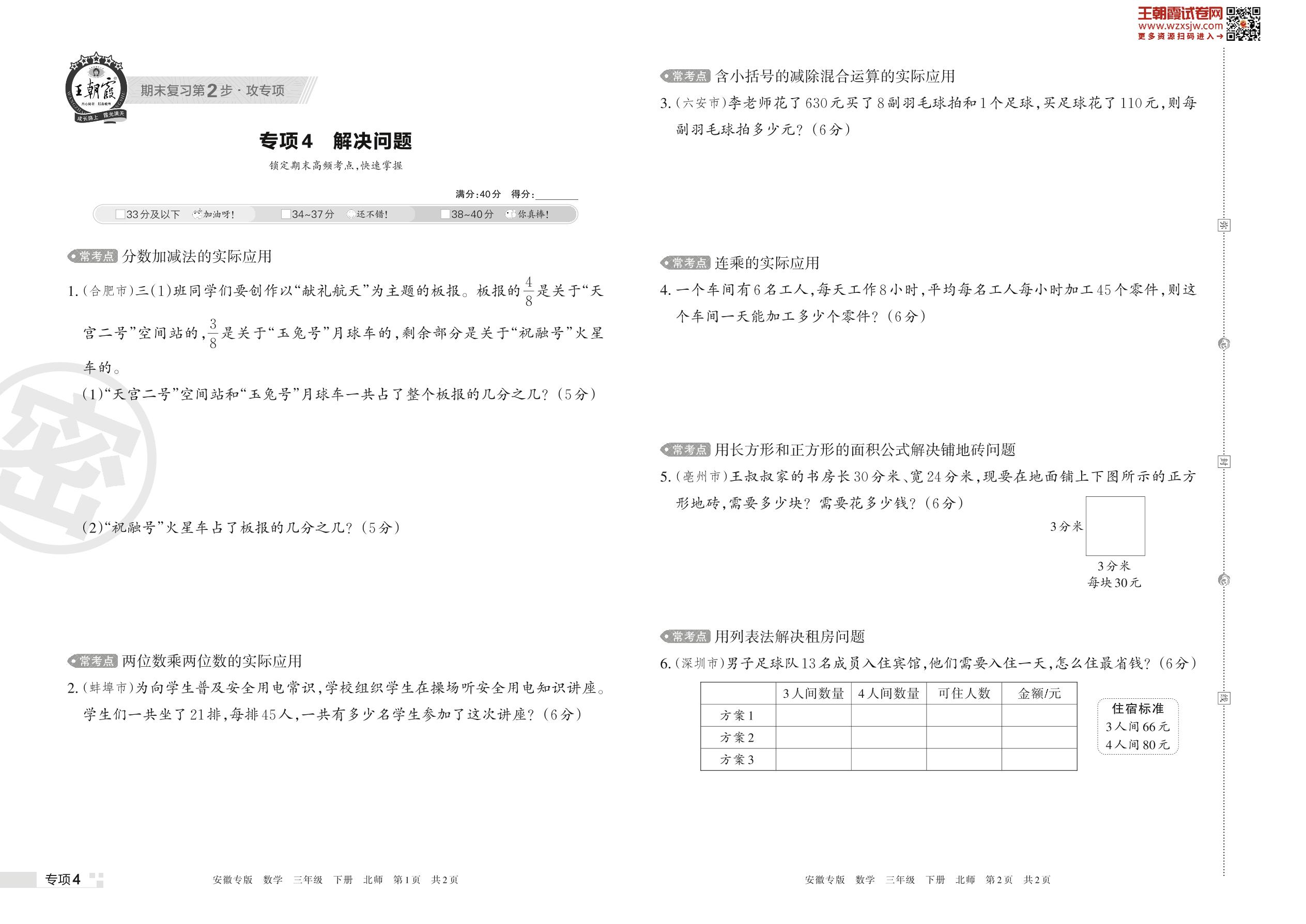 王朝霞期末专项卷——解决问题三年级下册数学(北师版)_R230421122654106【4】