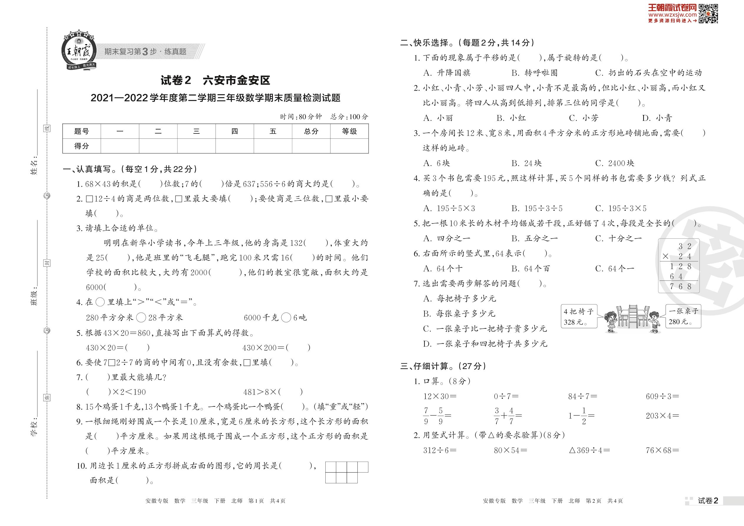 六安市金安区2021—2022学年度第二学期三年级数学期末质量检测试题(北师版)【2】