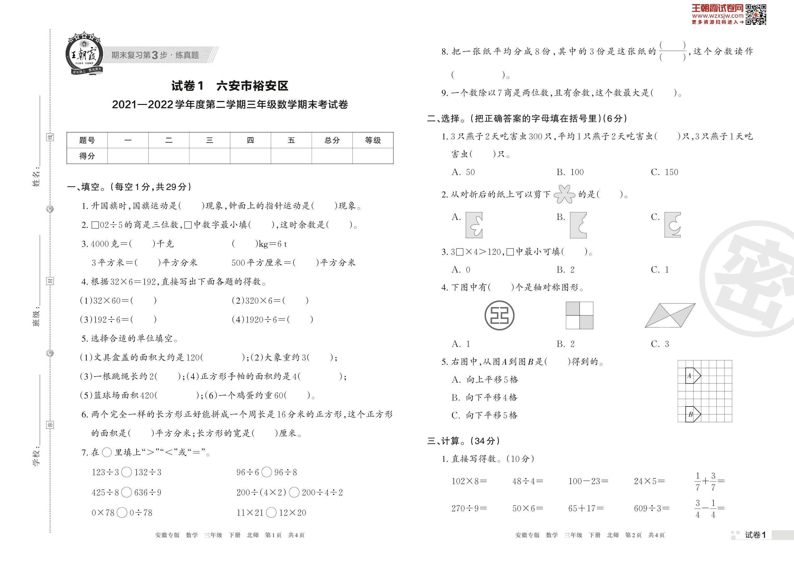 六安市裕安区2021—2022学年度第二学期三年级数学期末考试卷(北师版)【1】