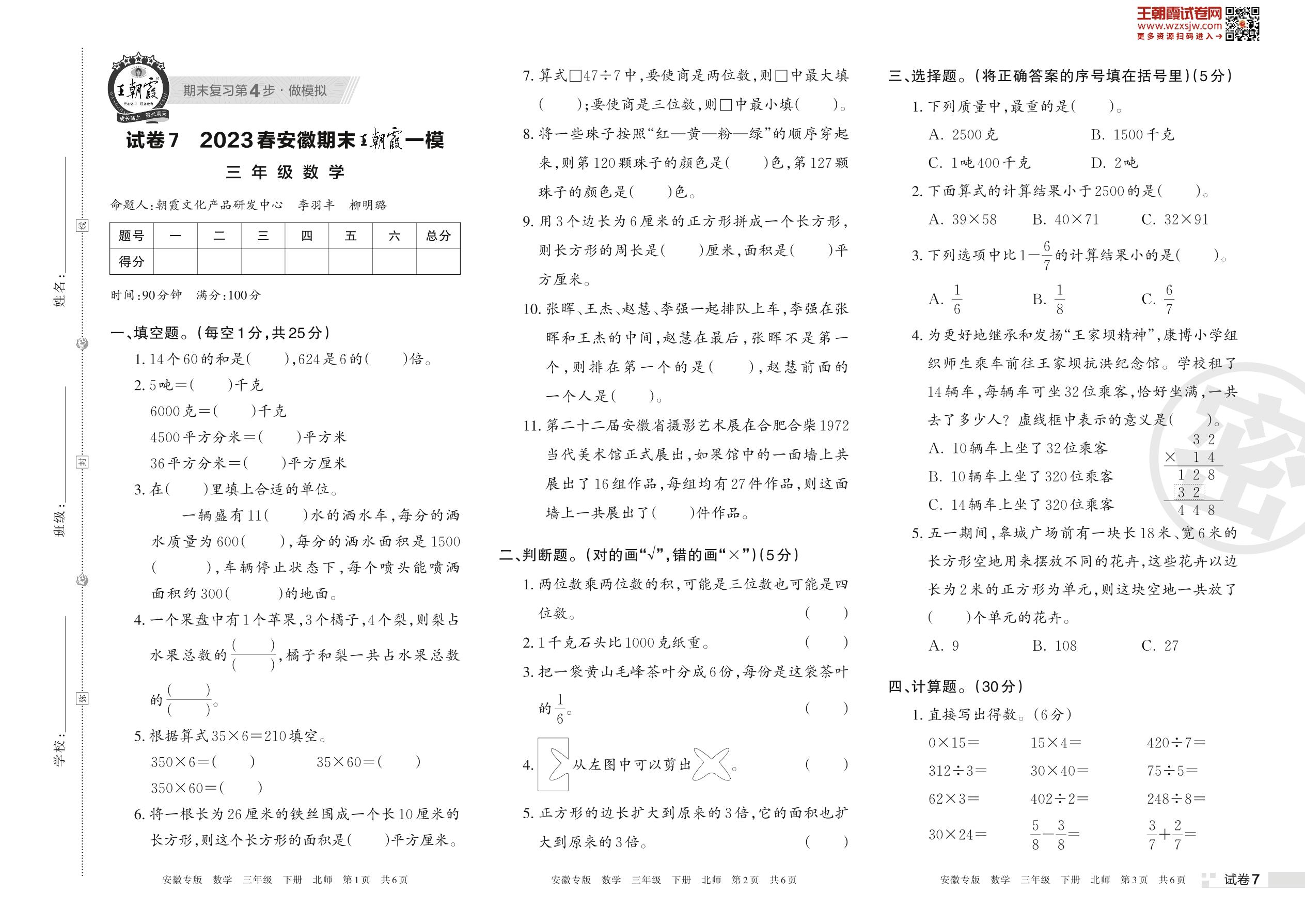 王朝霞期末模拟卷三年级下册数学(北师版)_R230421122655264【8】