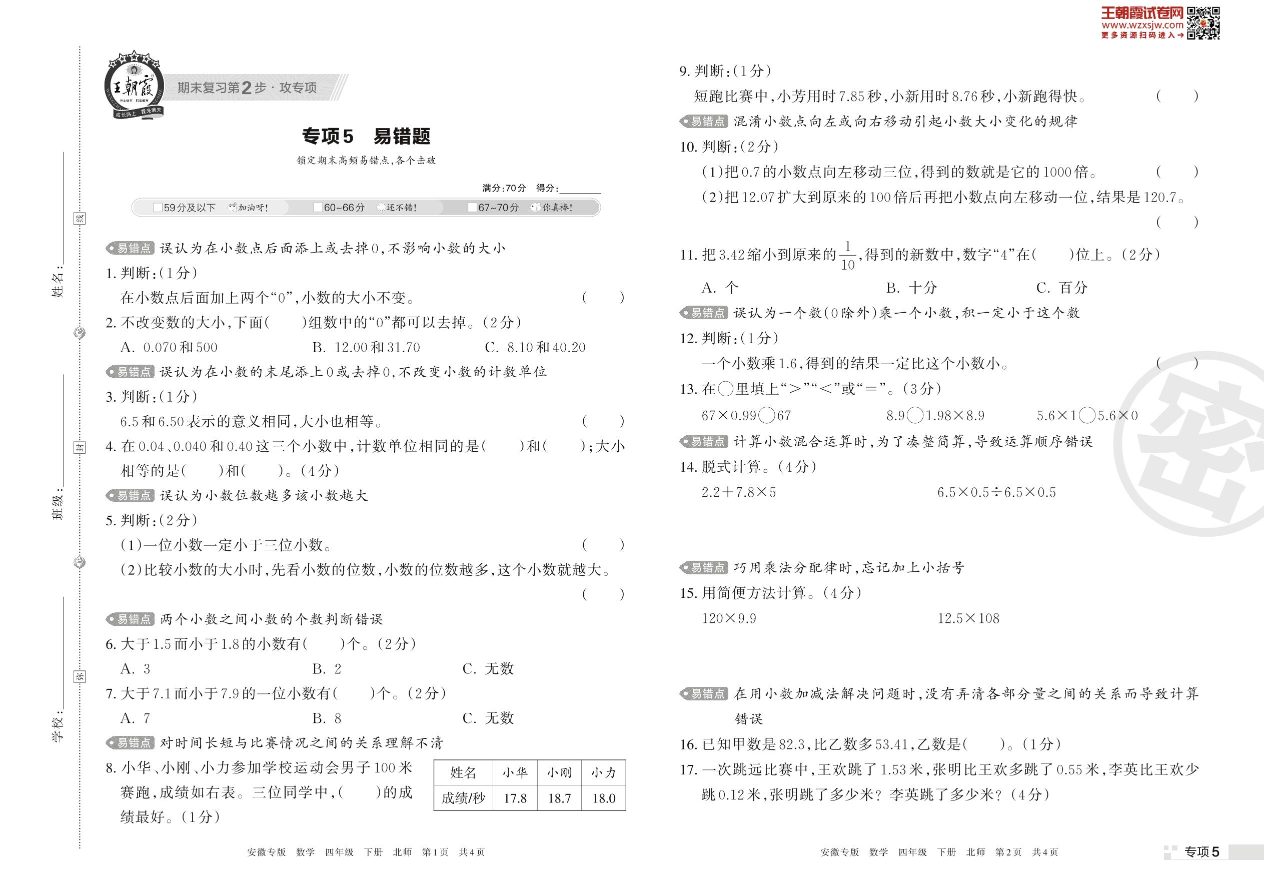 王朝霞期末专项卷——易错题四年级下册数学(北师版)_R230421135213748【5】