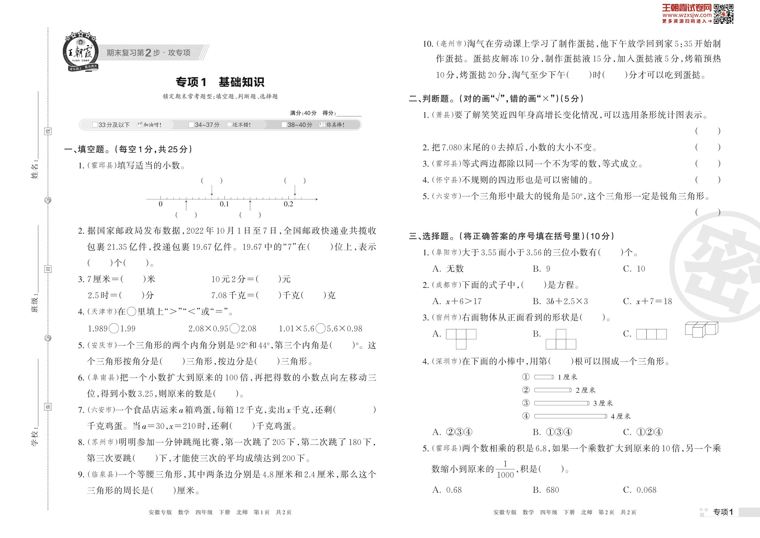 王朝霞期末专项卷——基础知识四年级下册数学(北师版)_R230421135213586【1】