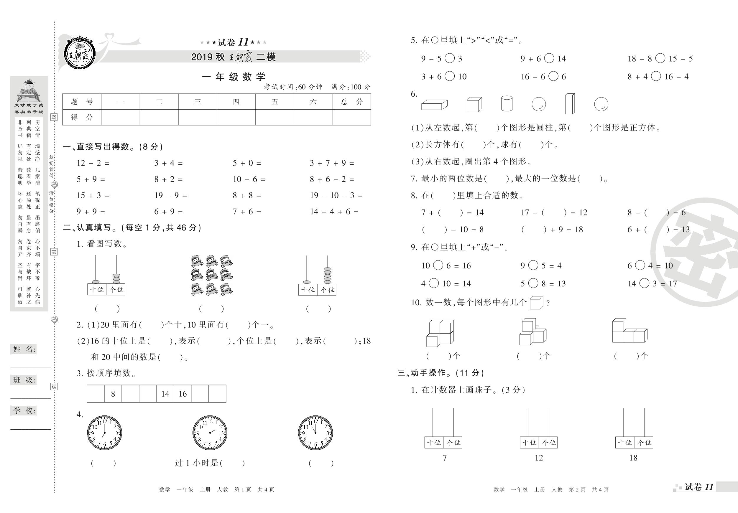 王朝霞期末模拟卷一年级上册数学(人教版)_R210802215224【11】