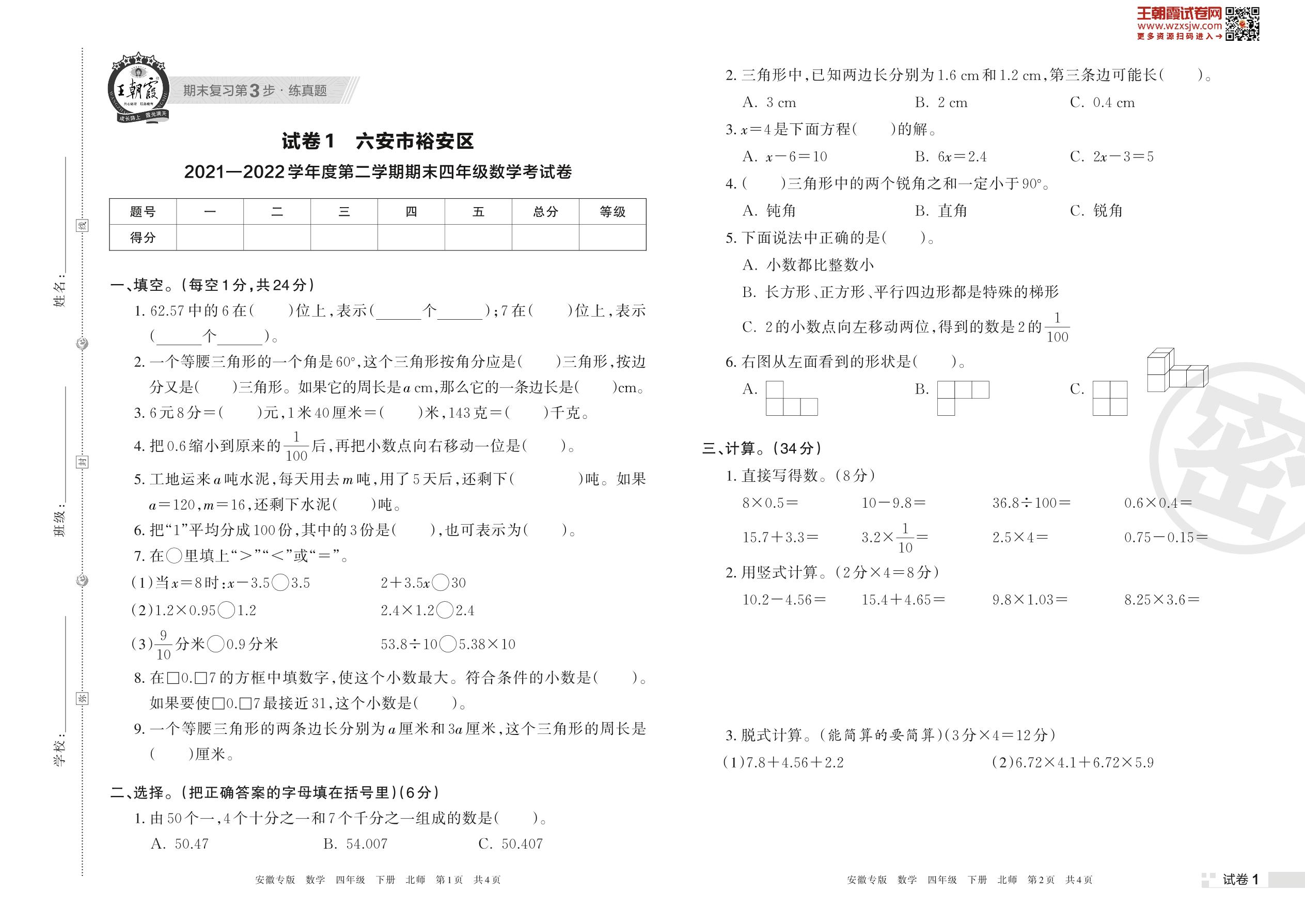 六安市裕安区2021—2022学年度第二学期期末四年级数学考试卷(北师版)【2】