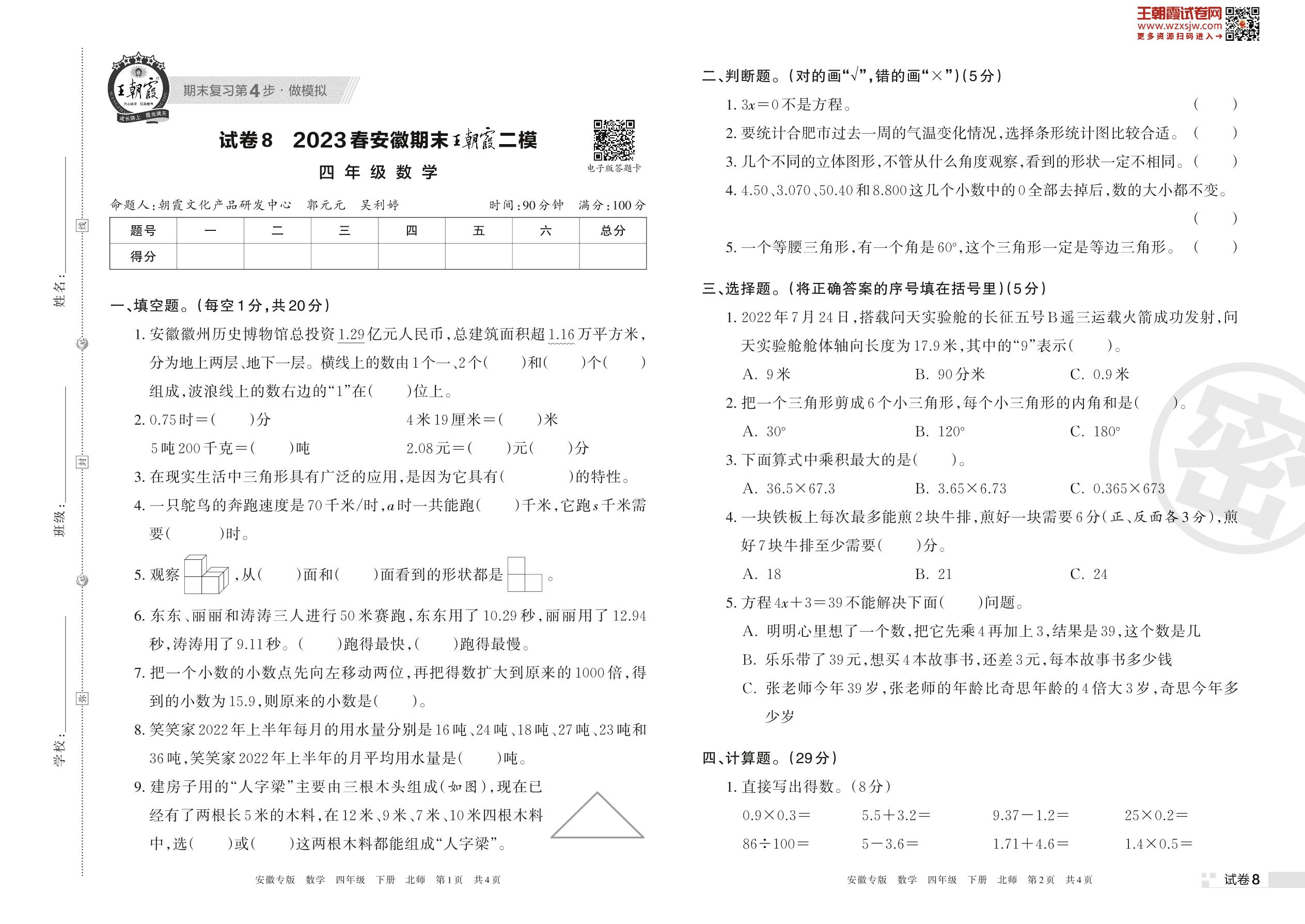 王朝霞期末模拟卷四年级下册数学(北师版)_R230421135214828【9】