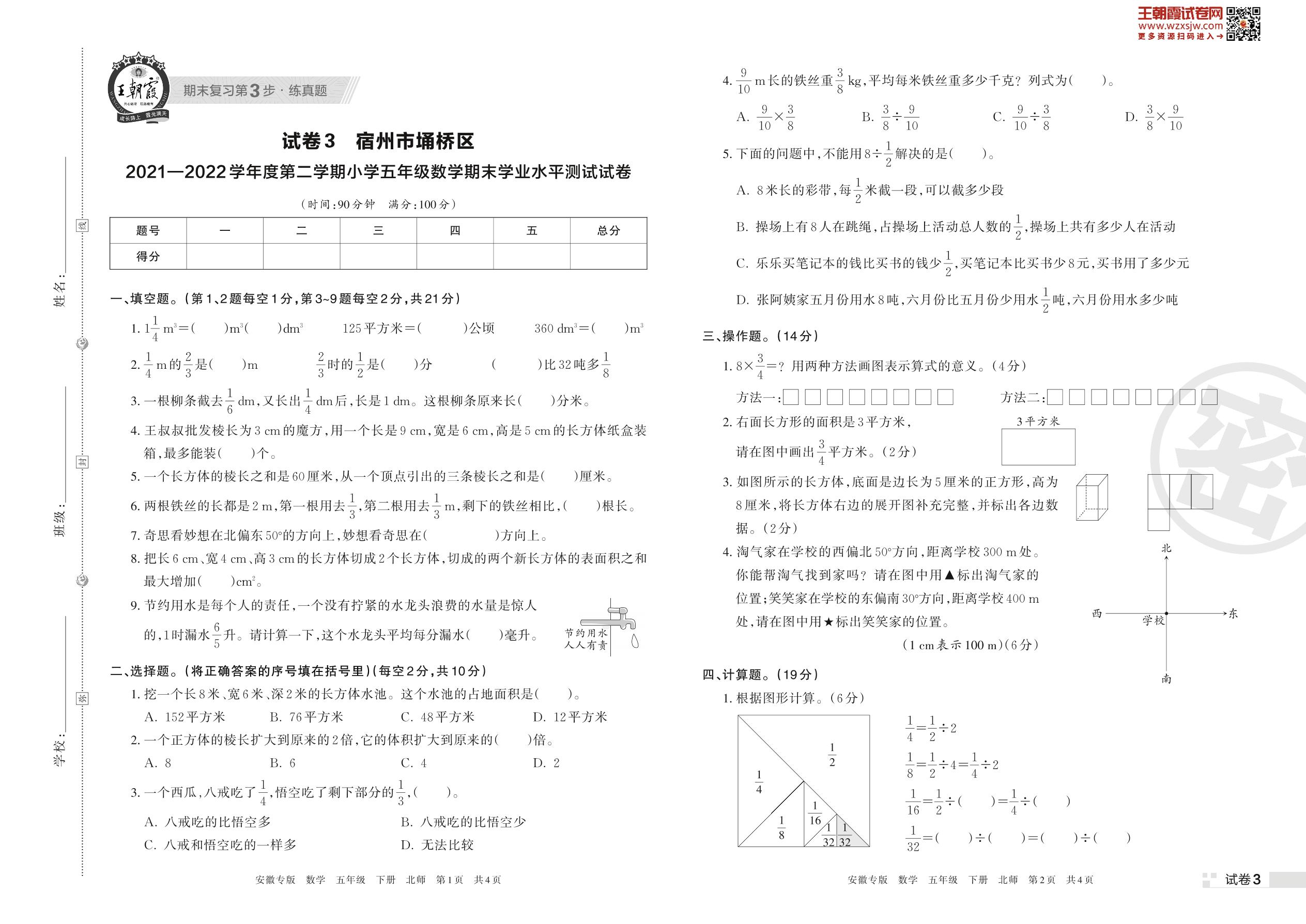 宿州市埇桥区2021—2022学年度第二学期小学五年级数学期末学业水平测试试卷(北师版)【3】