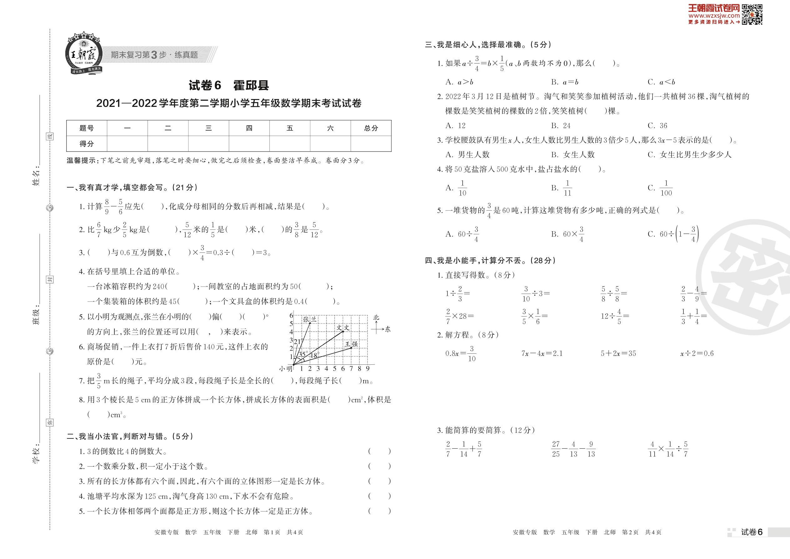 霍邱县2021—2022学年度第二学期小学五年级数学期末考试试卷(北师版)【6】