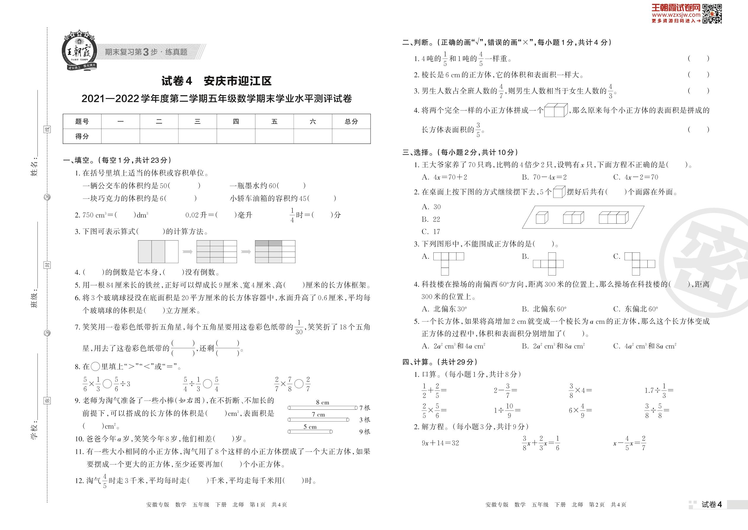 安庆市迎江区2021—2022学年度第二学期五年级数学期末学业水平测评试卷(北师版)【4】