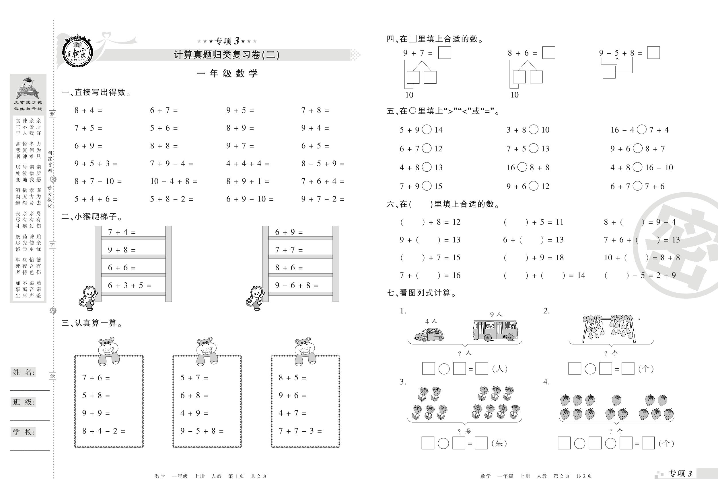 王朝霞期末专项卷——计算、解决问题真题归类复习一年级上册数学(人教版)_R210802215243【0】