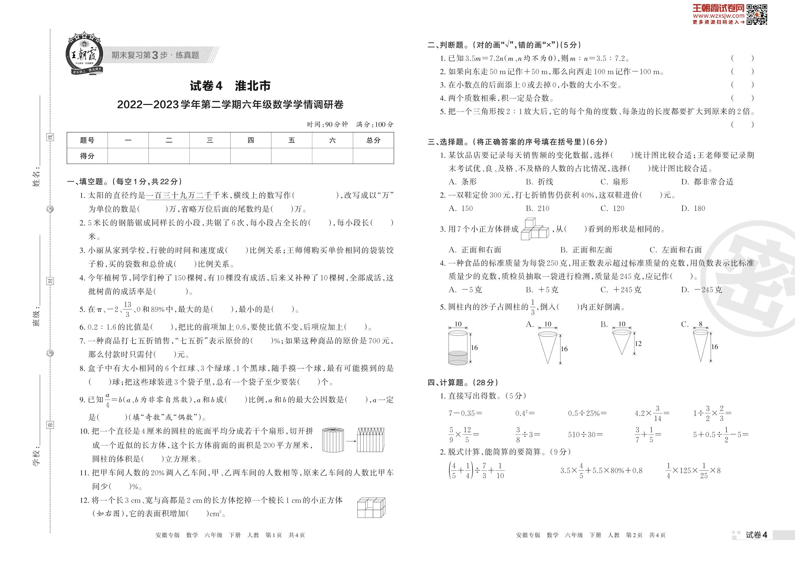淮北市2022—2023学年第二学期六年级数学学情调研卷(人教版)【4】
