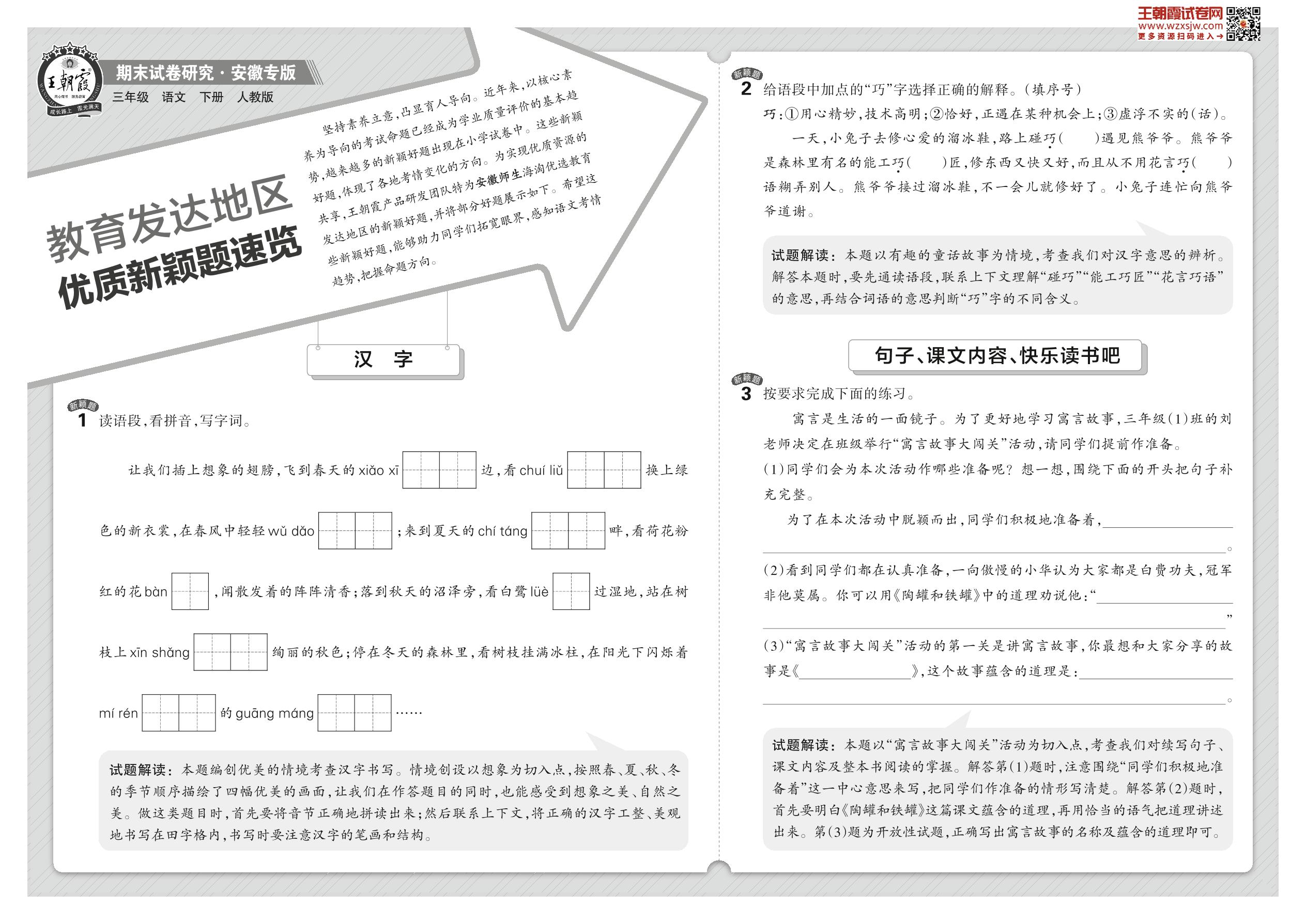 教育发达地区优质新颖题速览三年级下册语文(人教版)