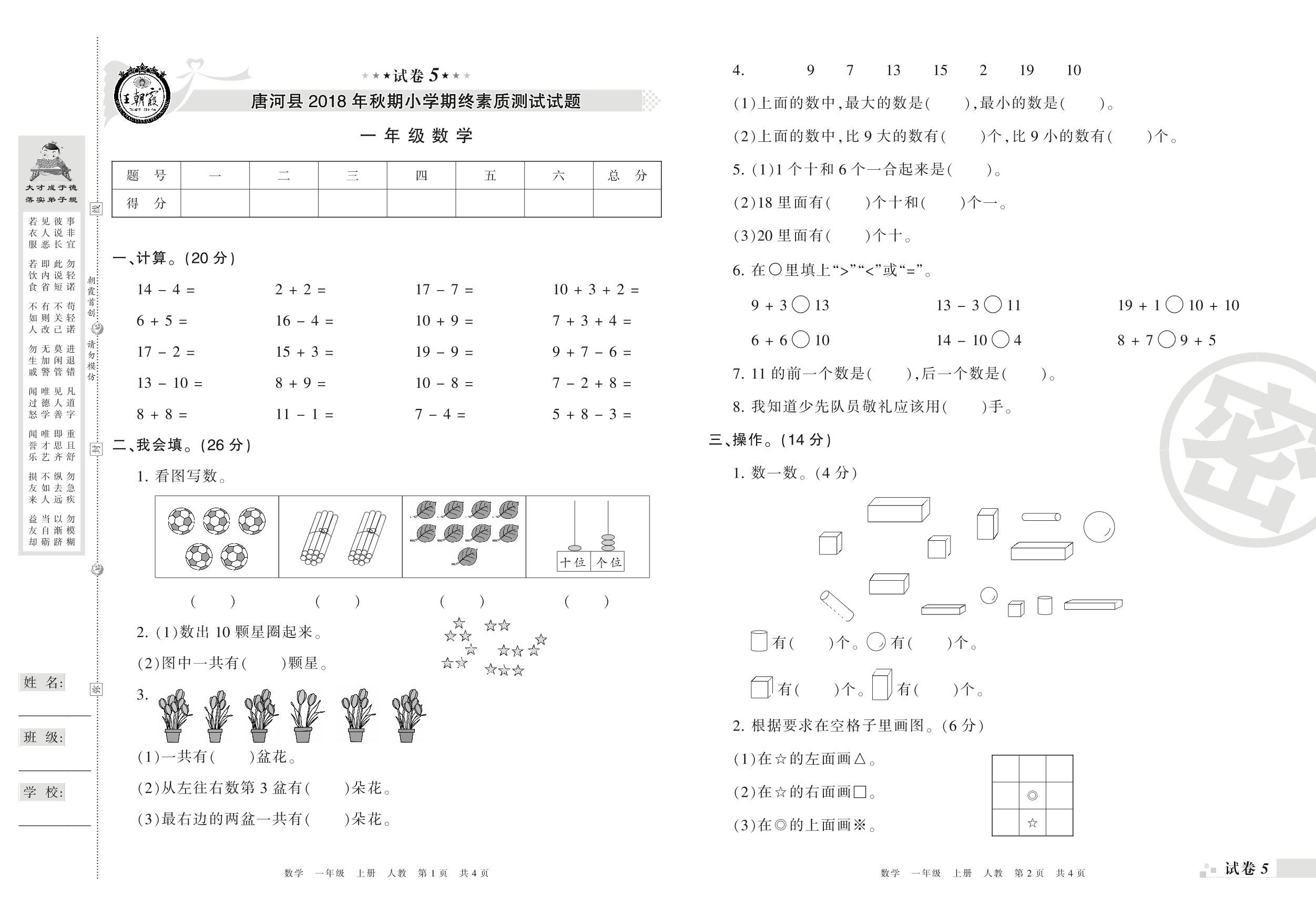 2018-2019学年第一学期南阳市唐河县一年级数学试卷(人教版)【5】