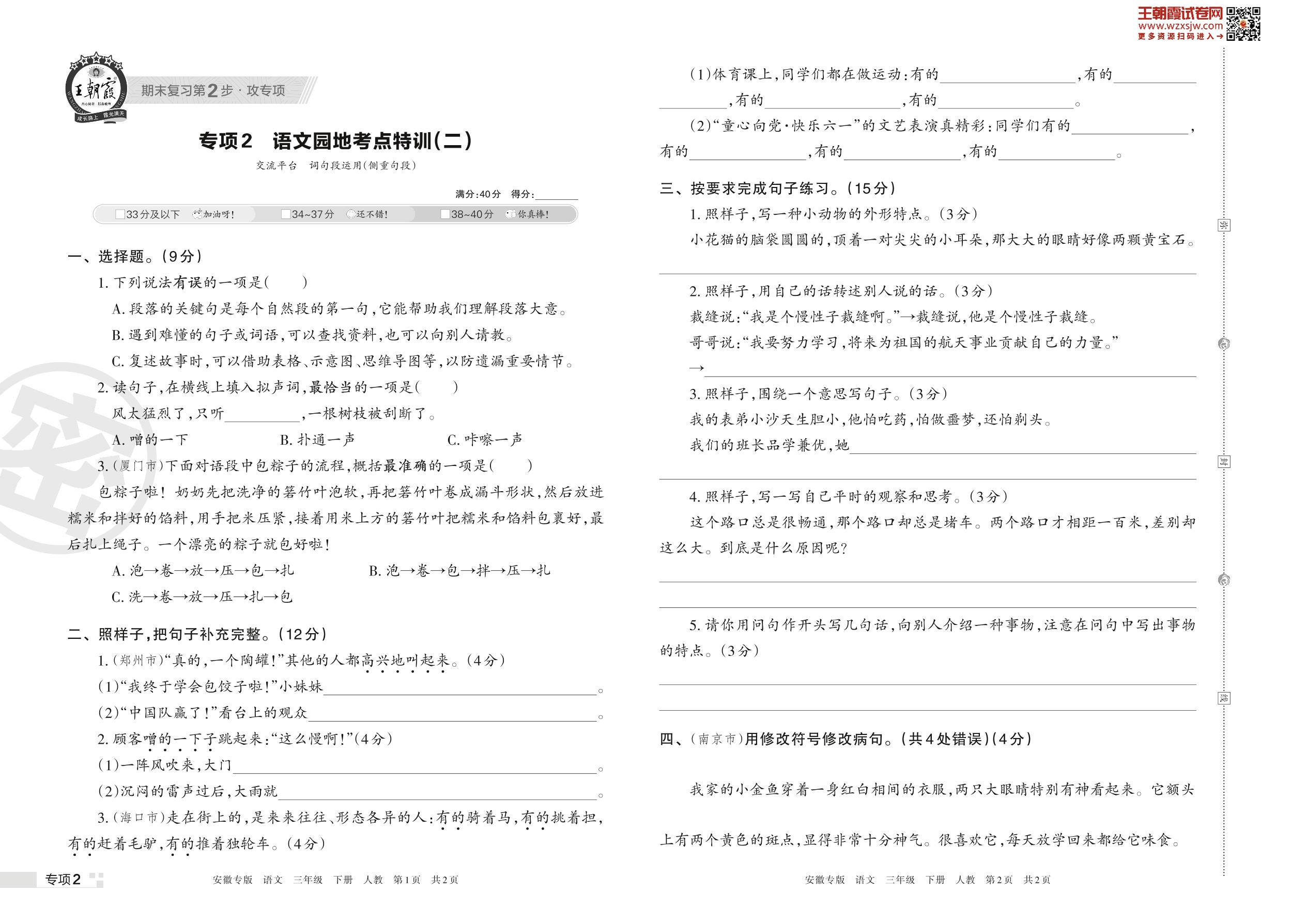 王朝霞期末专项卷——语文园地考点特训(二)三年级下册语文(人教版)_R230421161521254【2】