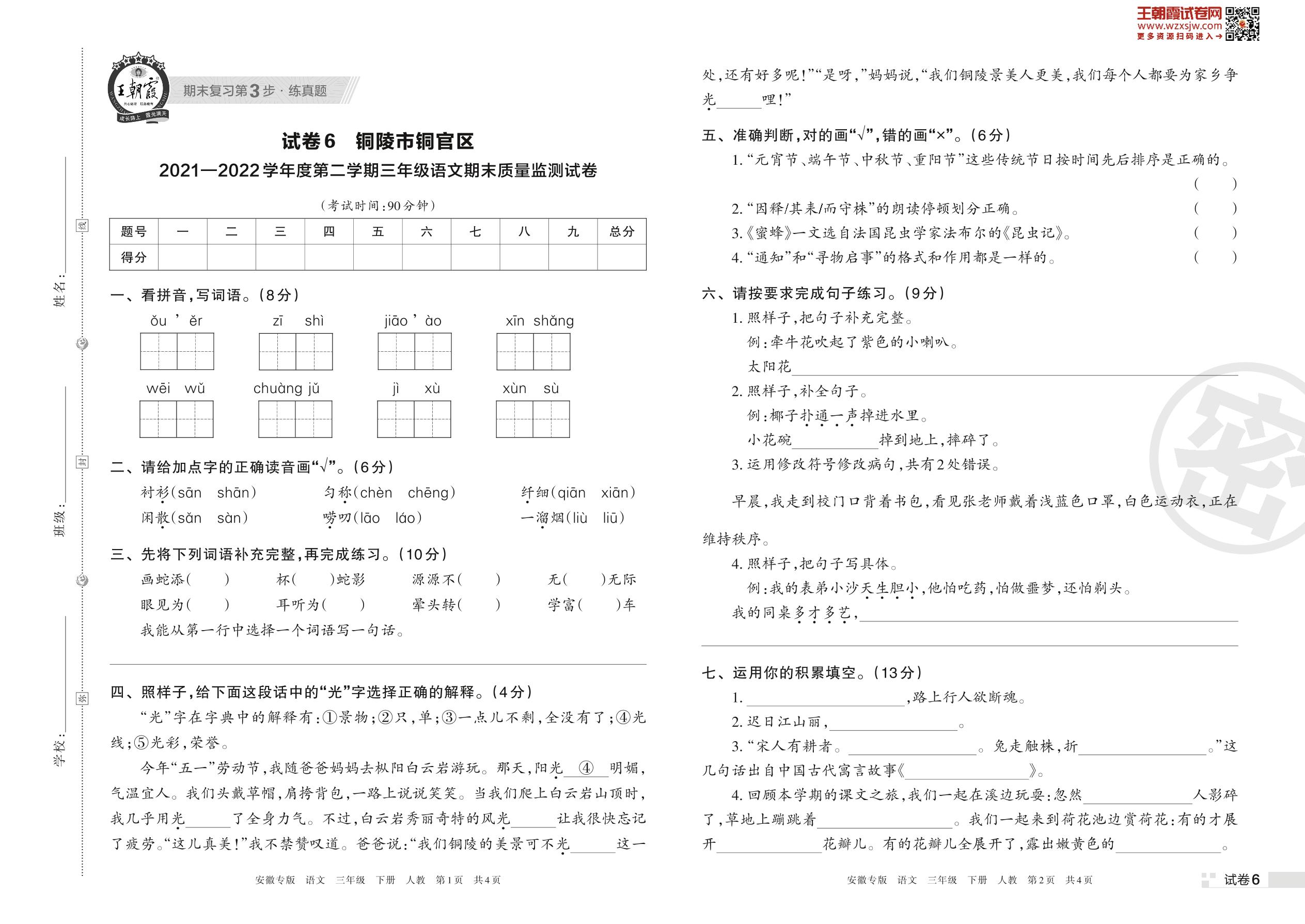 铜陵市铜官区2021—2022学年度第二学期三年级语文期末质量监测试卷(人教版)【6】