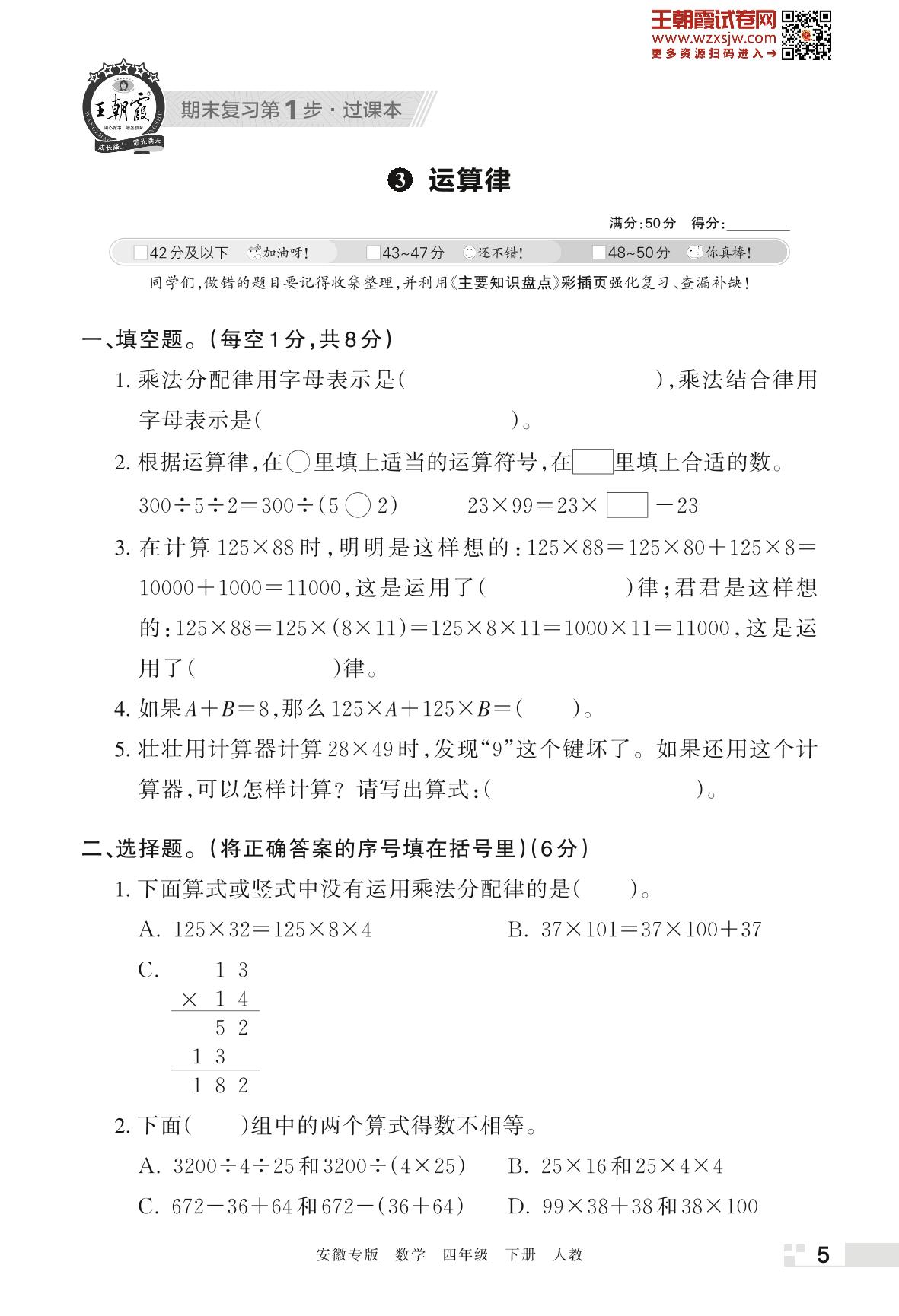 王朝霞期末过课本——3 运算律四年级下册数学(人教版)
