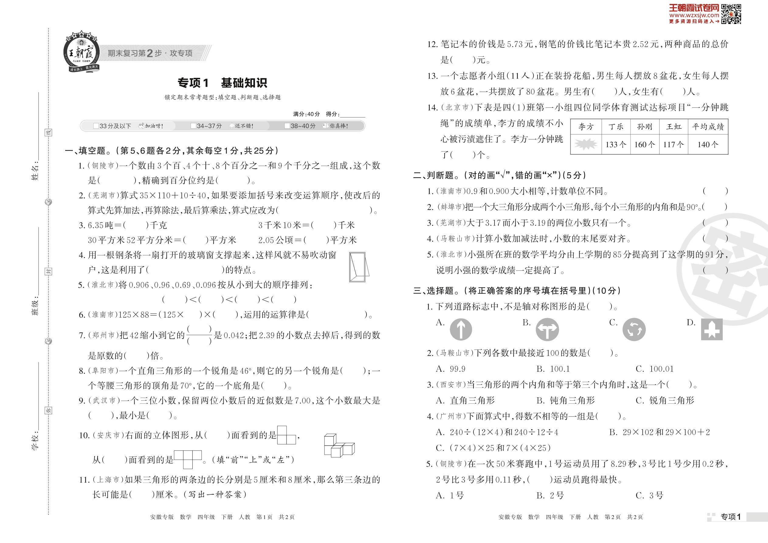 王朝霞期末专项卷——基础知识四年级下册数学(人教版)_R230421162815695【1】