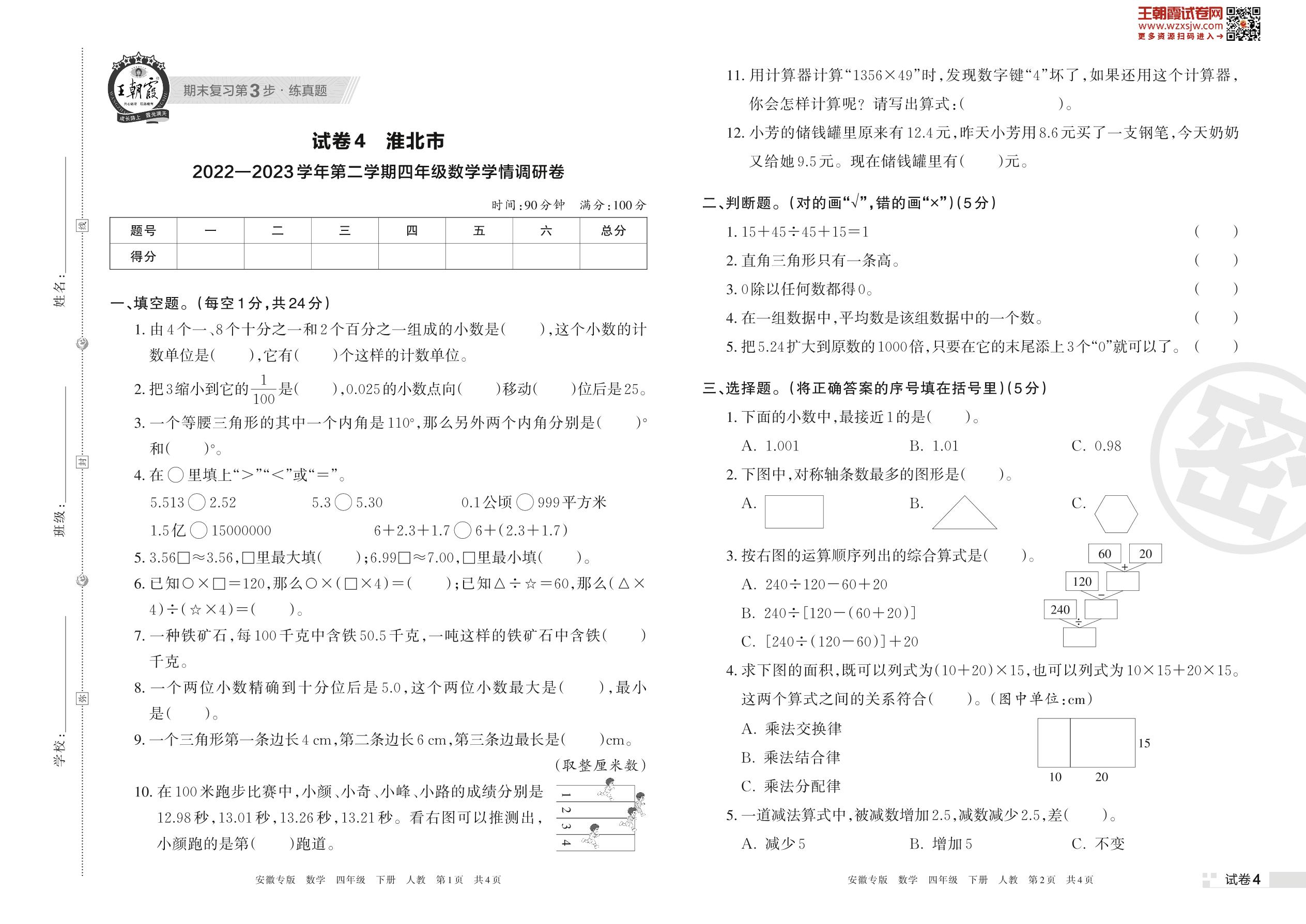 淮北市2022—2023学年第二学期四年级数学学情调研卷(人教版)【4】