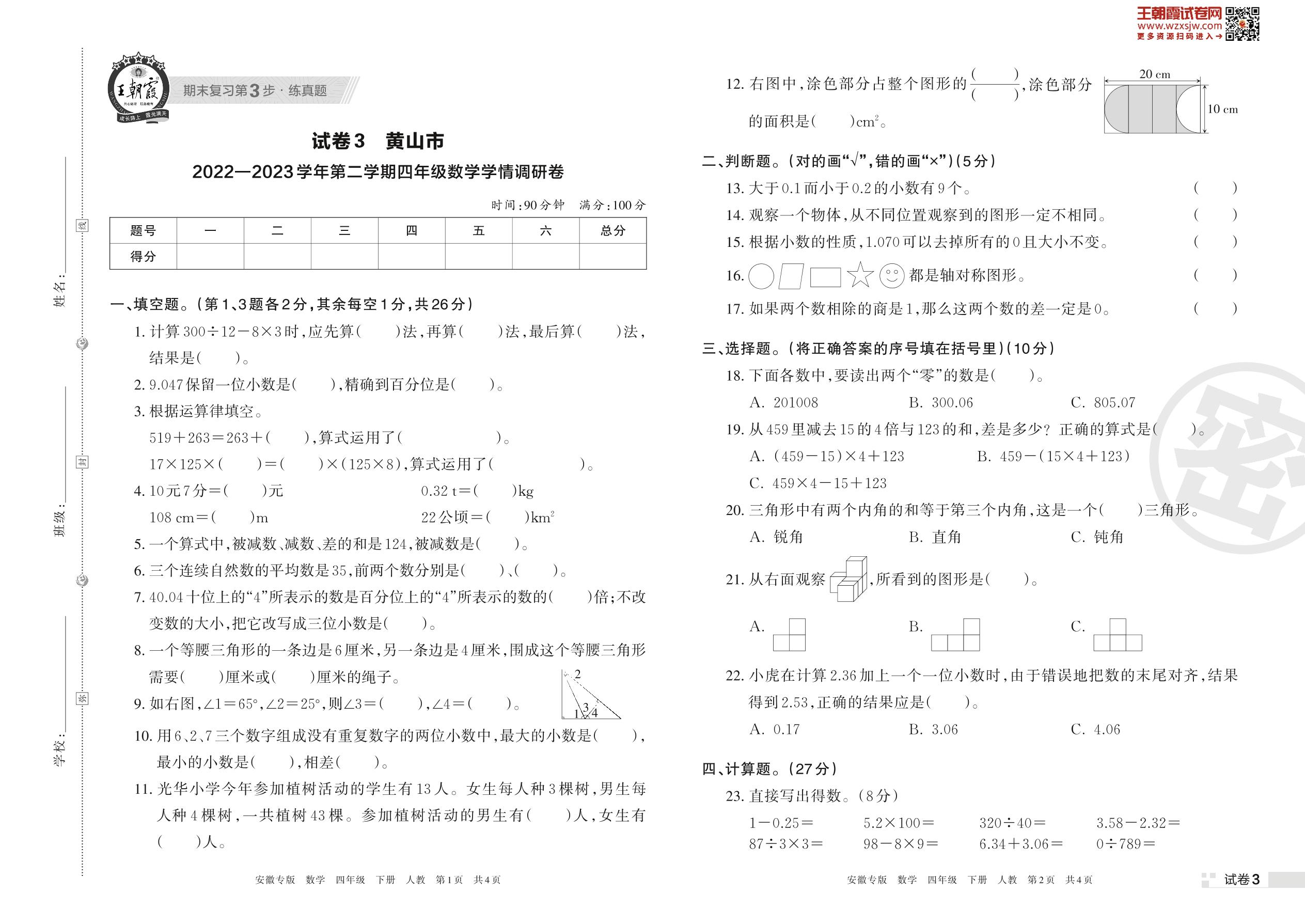 黄山市2022—2023学年第二学期四年级数学学情调研卷(人教版)【3】