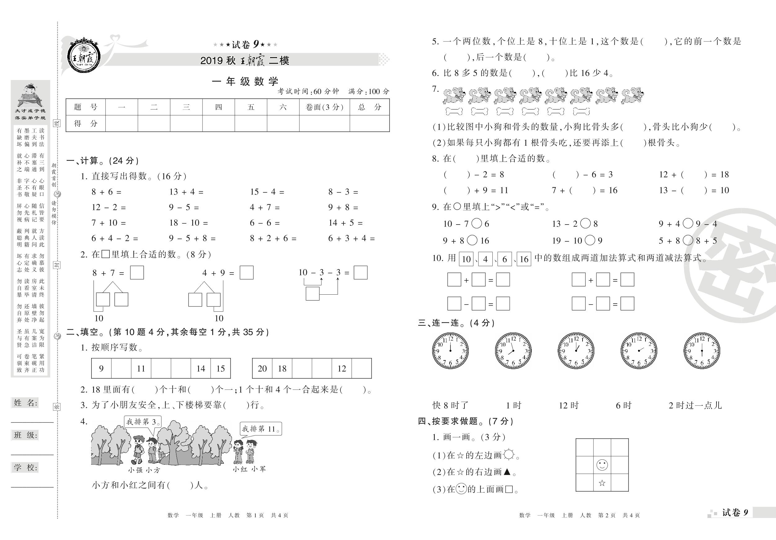 王朝霞期末模拟卷一年级上册数学(人教版)_R210802215318【9】