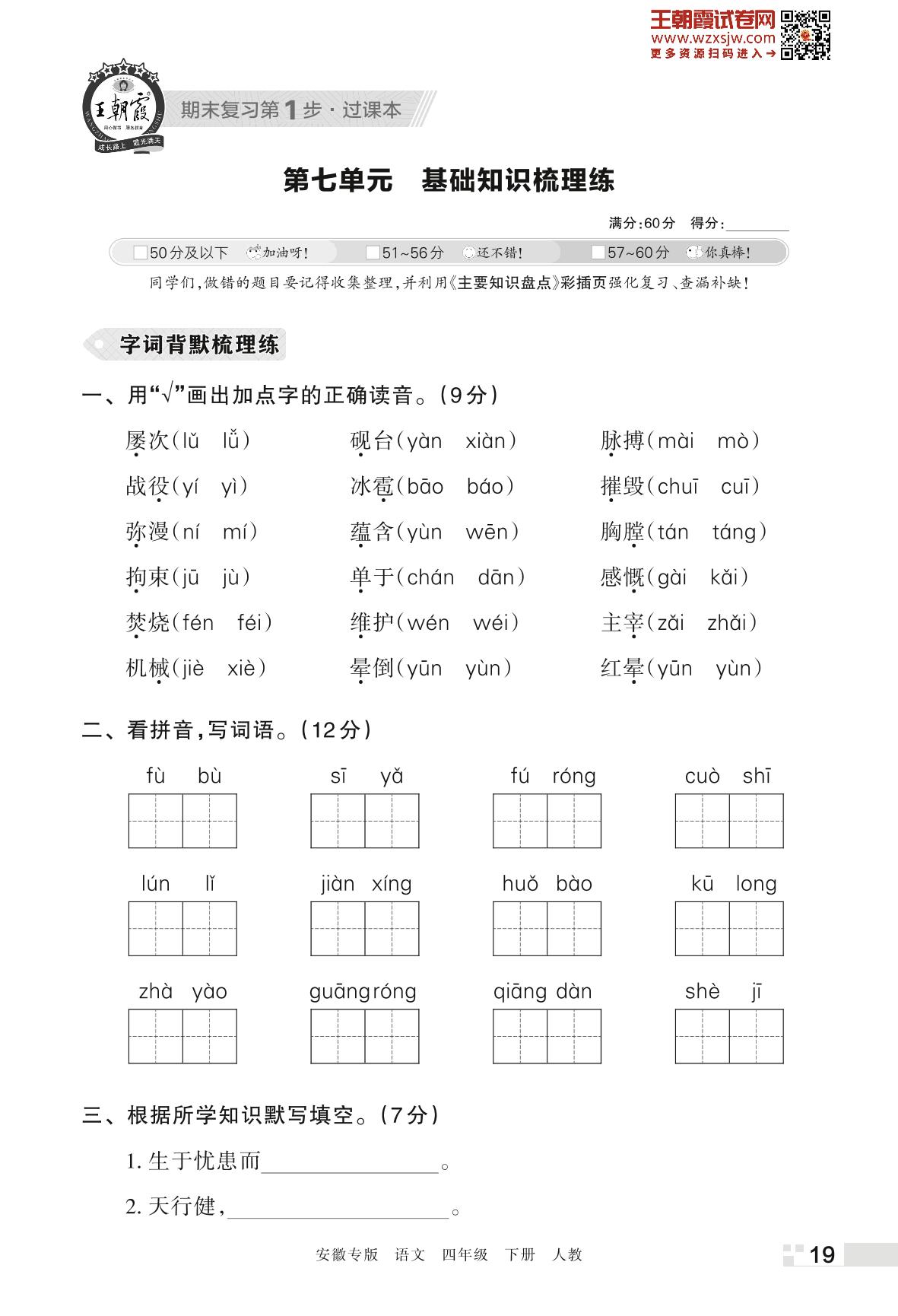 王朝霞期末过课本——第七单元 基础知识梳理练四年级下册语文(人教版)_R230421163436785