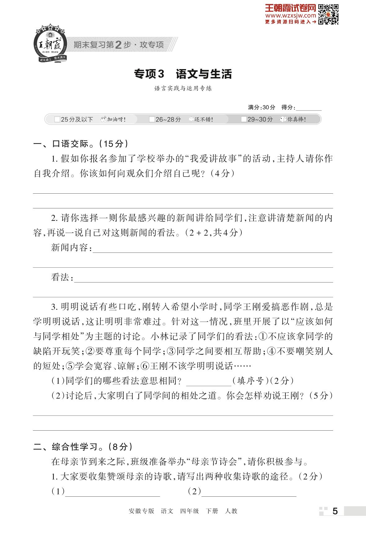 王朝霞期末专项卷——语文与生活四年级下册语文(人教版)【3】
