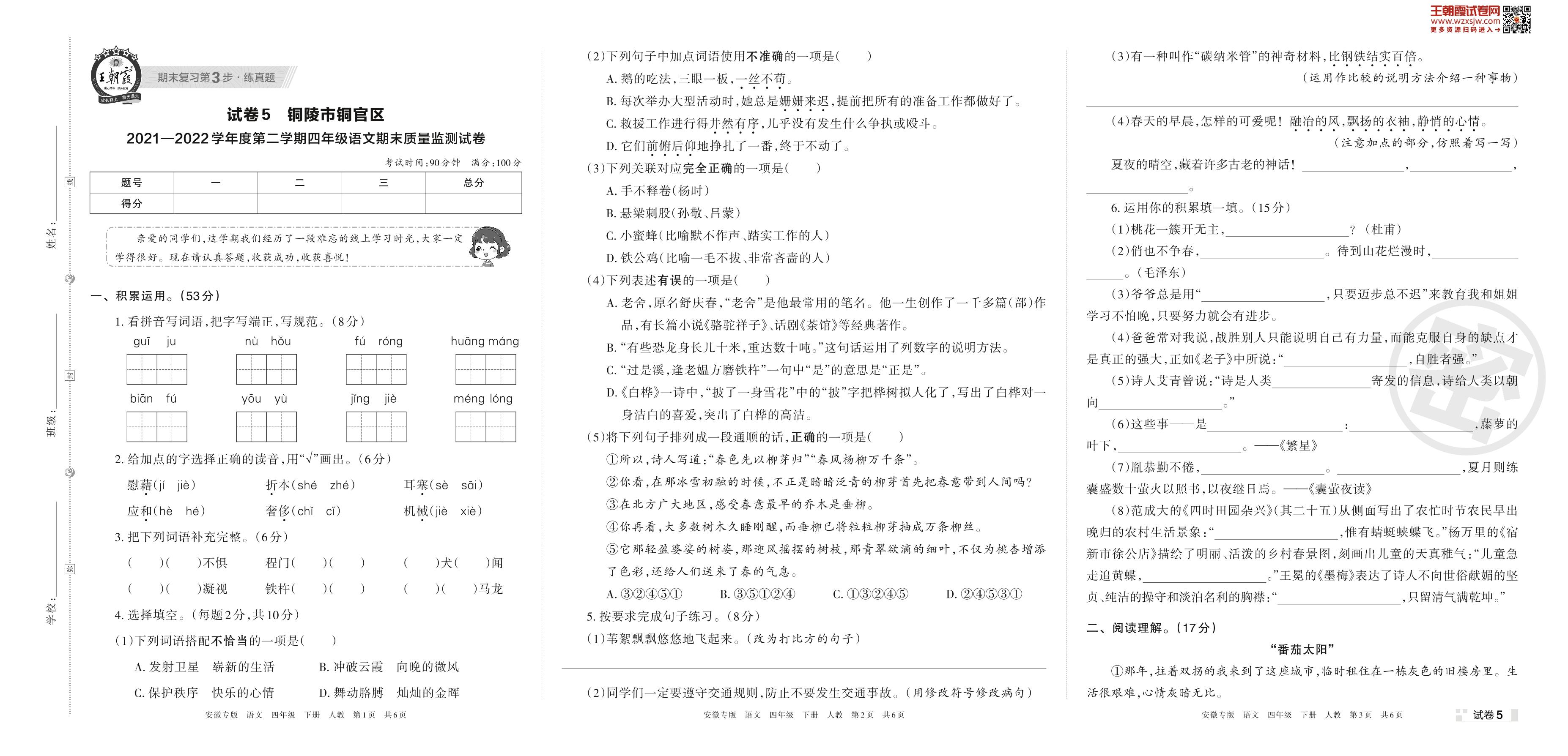 铜陵市铜官区2021—2022学年度第二学期四年级语文期末质量监测试卷(人教版)【5】