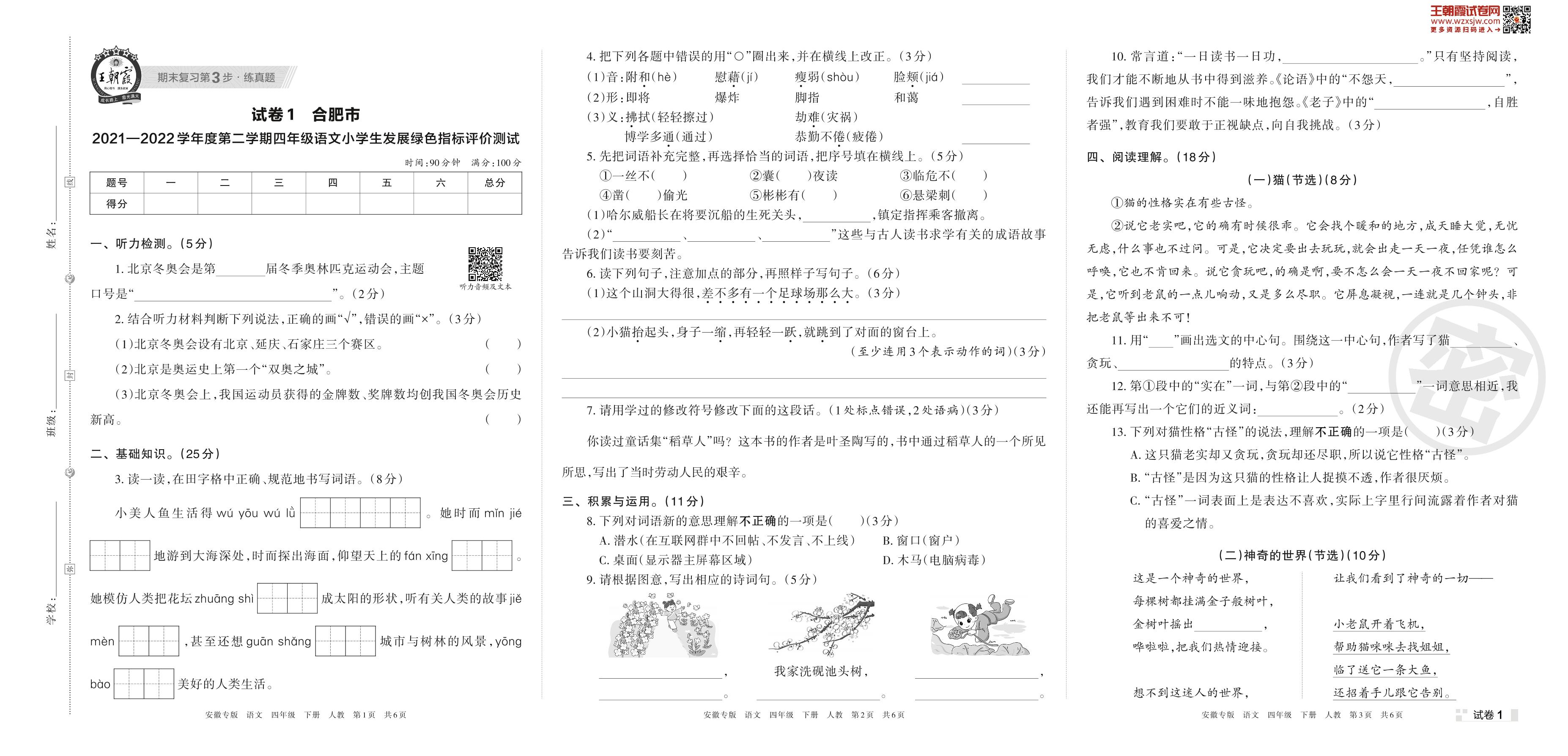 合肥市2021—2022学年度第二学期四年级语文小学生发展绿色指标评价测试(人教版)【1】