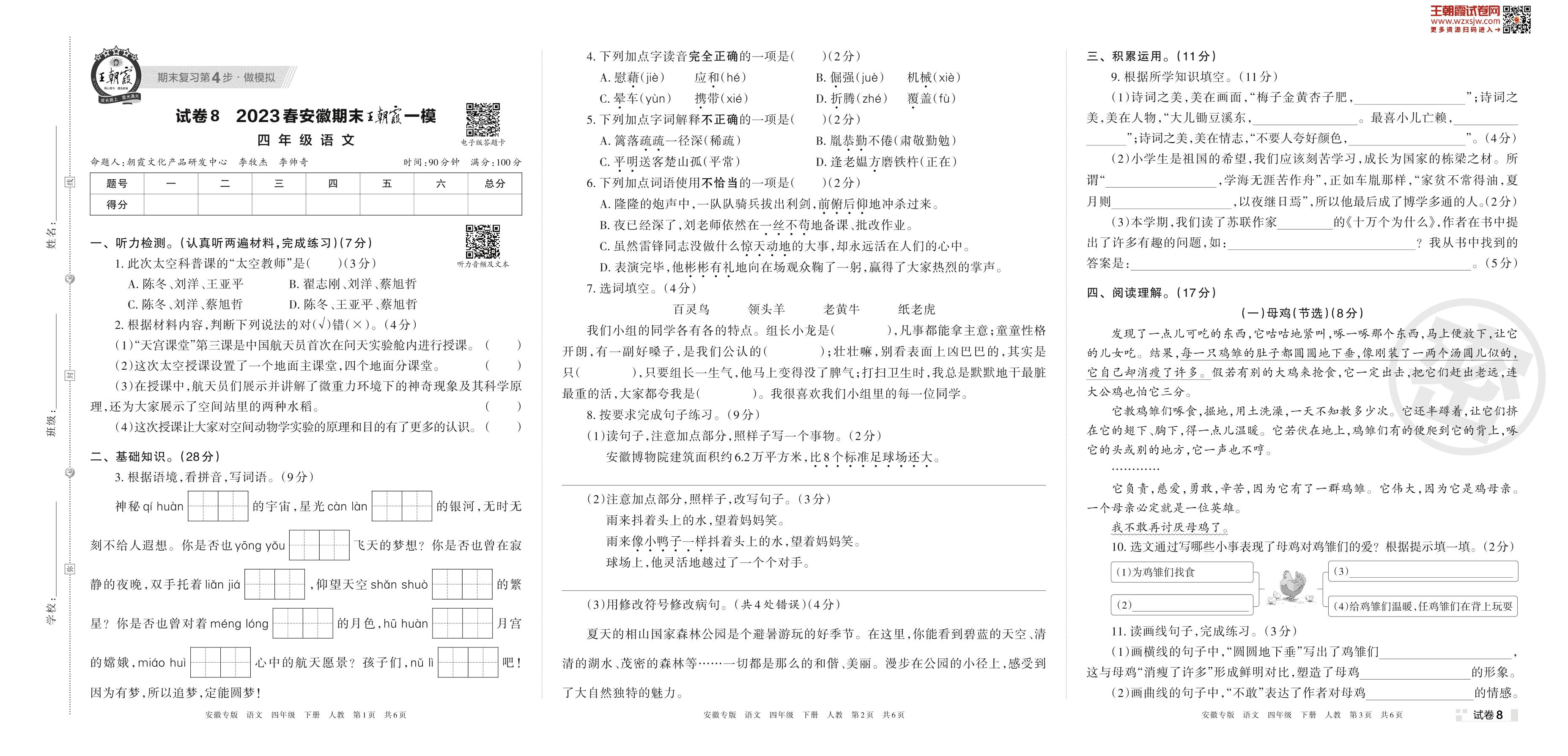王朝霞期末模拟卷四年级下册语文(人教版)_R230421163438430【8】