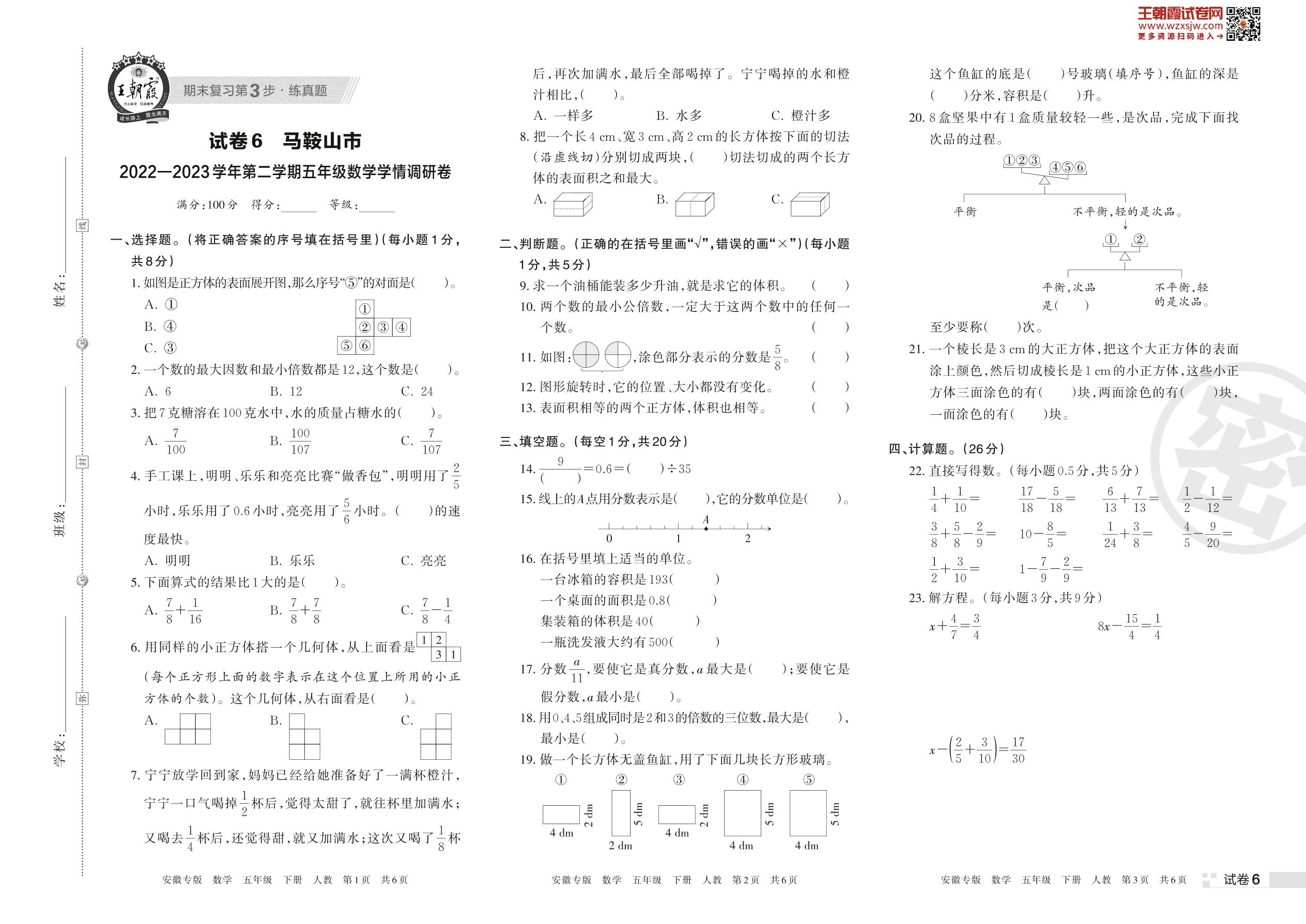 马鞍山市2022—2023学年第二学期五年级数学学情调研卷(人教版)【6】