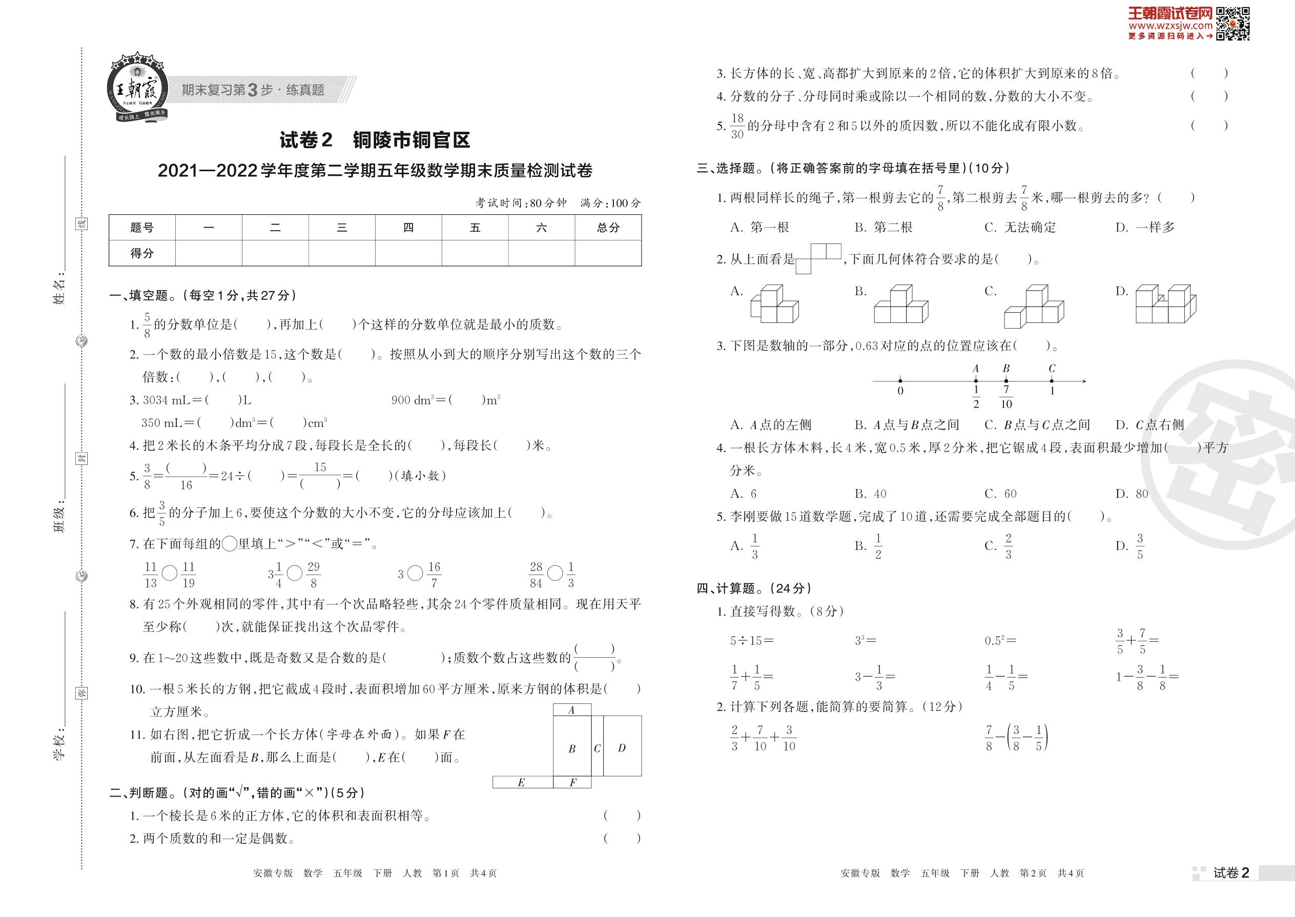 铜陵市铜官区2021—2022学年度第二学期五年级数学期末质量检测试卷(人教版)【2】