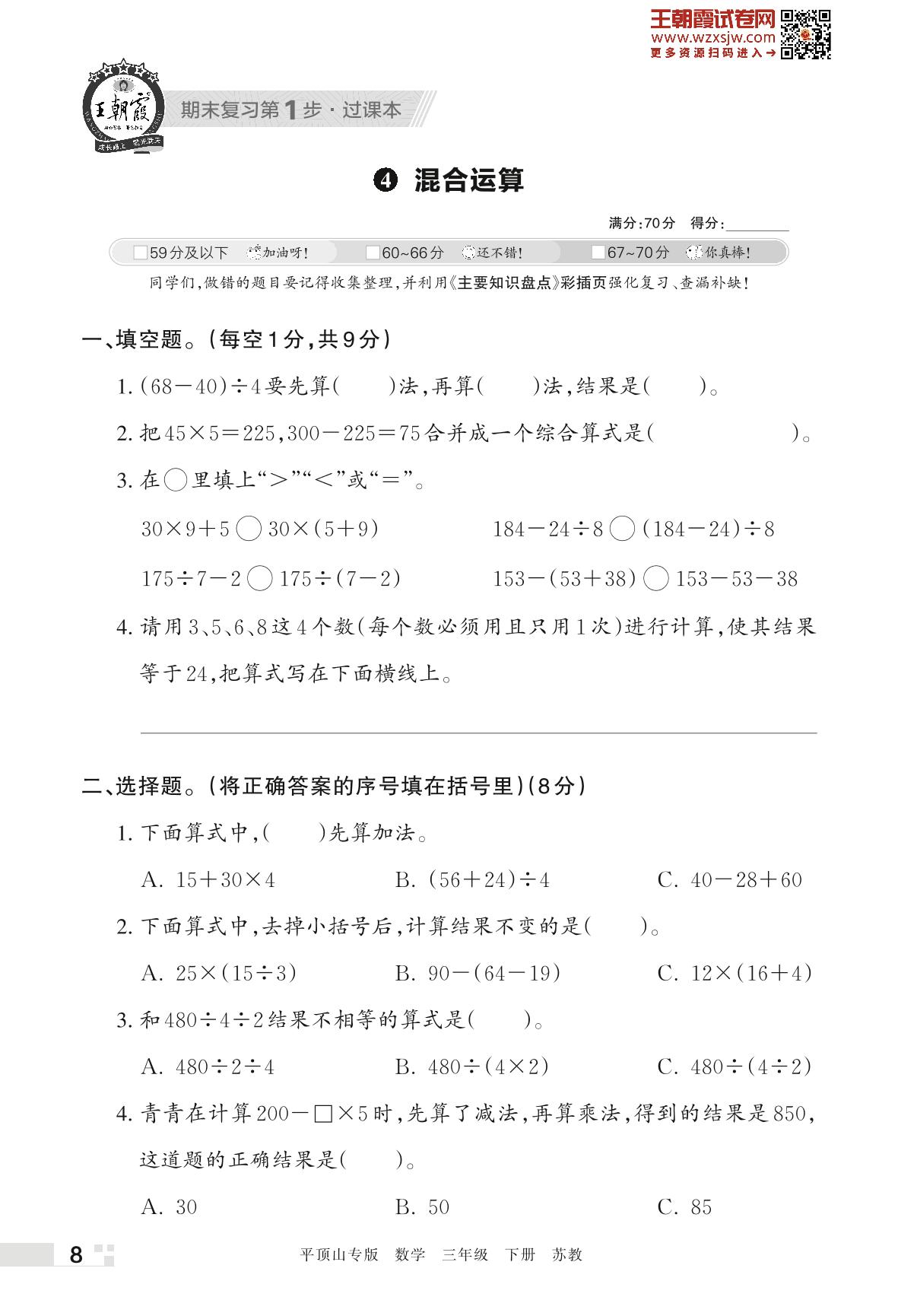 王朝霞期末过课本——4 混合运算三年级下册数学(苏教版)