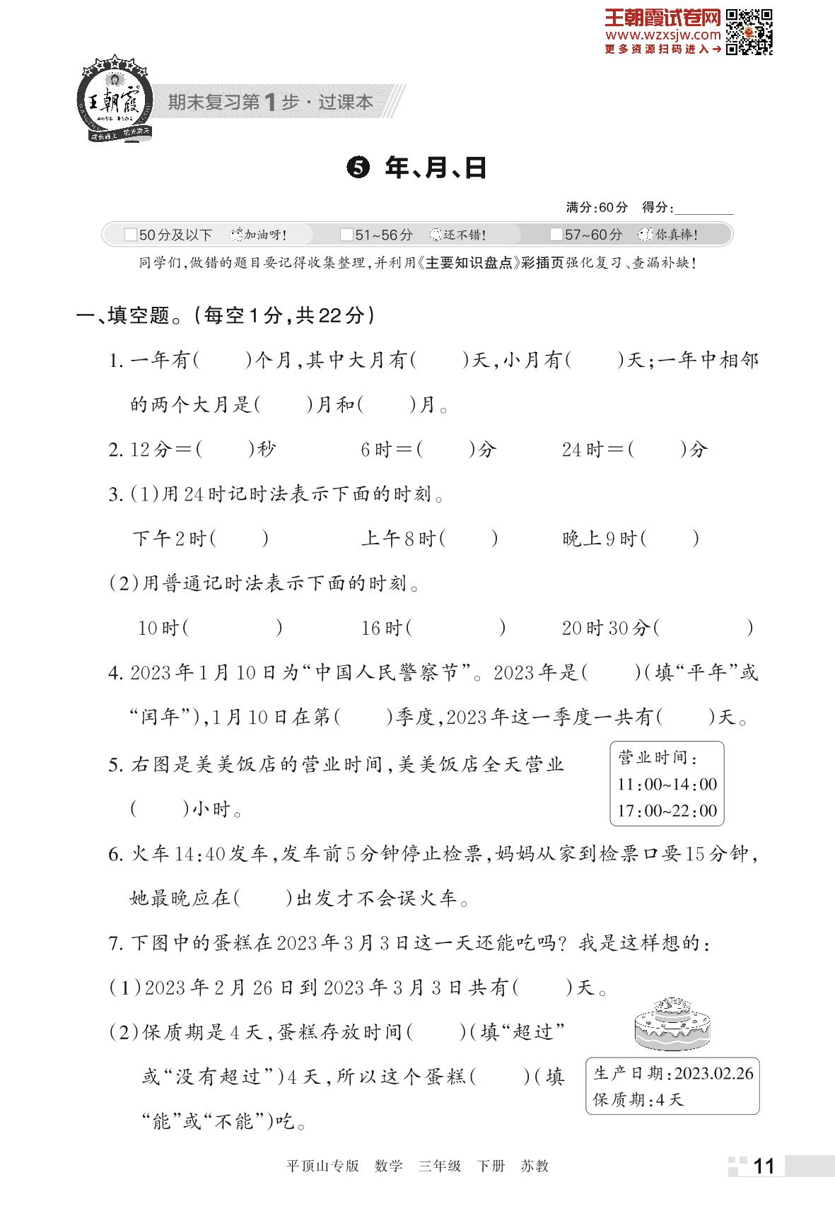 王朝霞期末过课本——5 年、月、日三年级下册数学(苏教版)