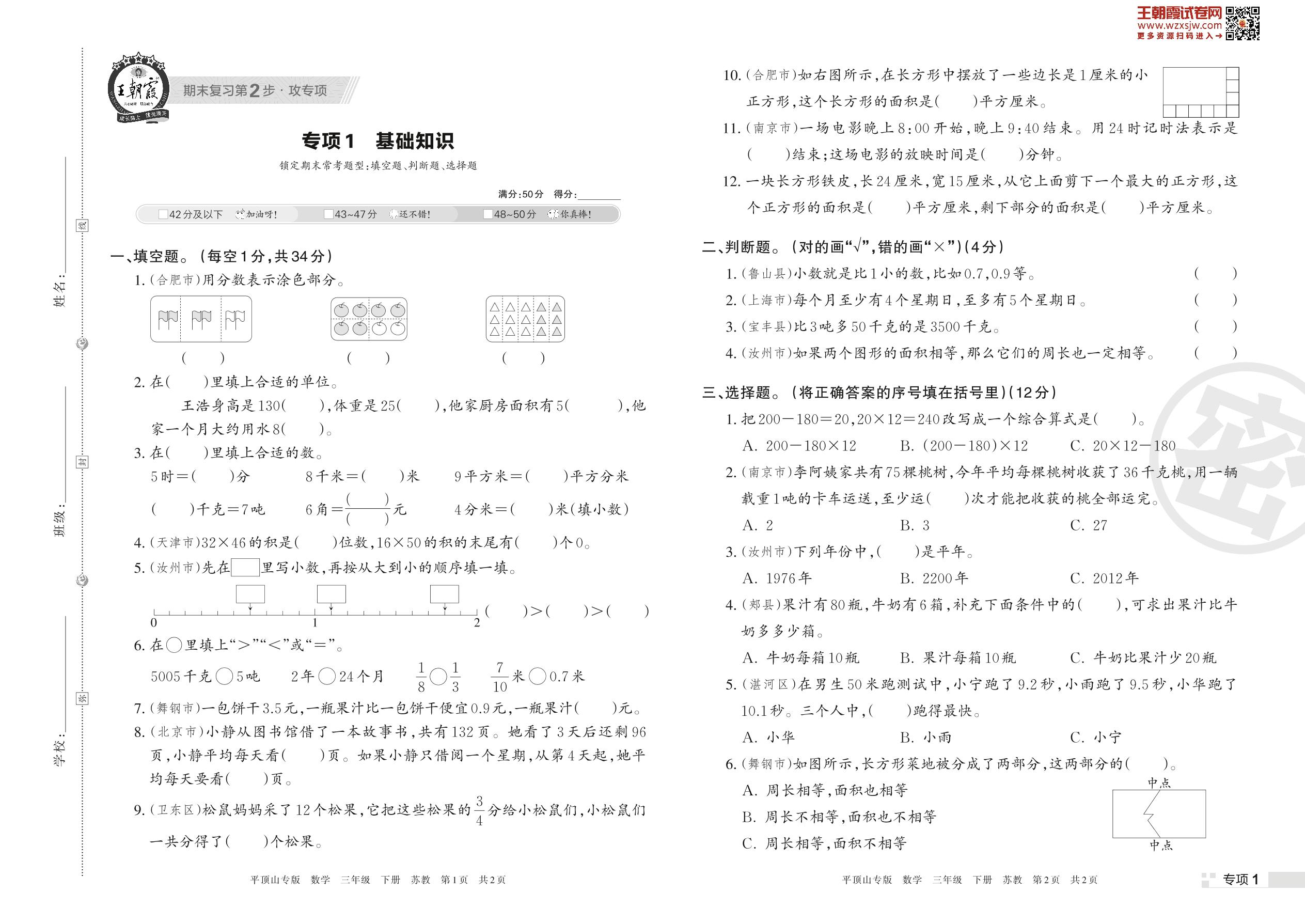王朝霞期末专项卷——基础知识三年级下册数学(苏教版)_R230421164849803【1】