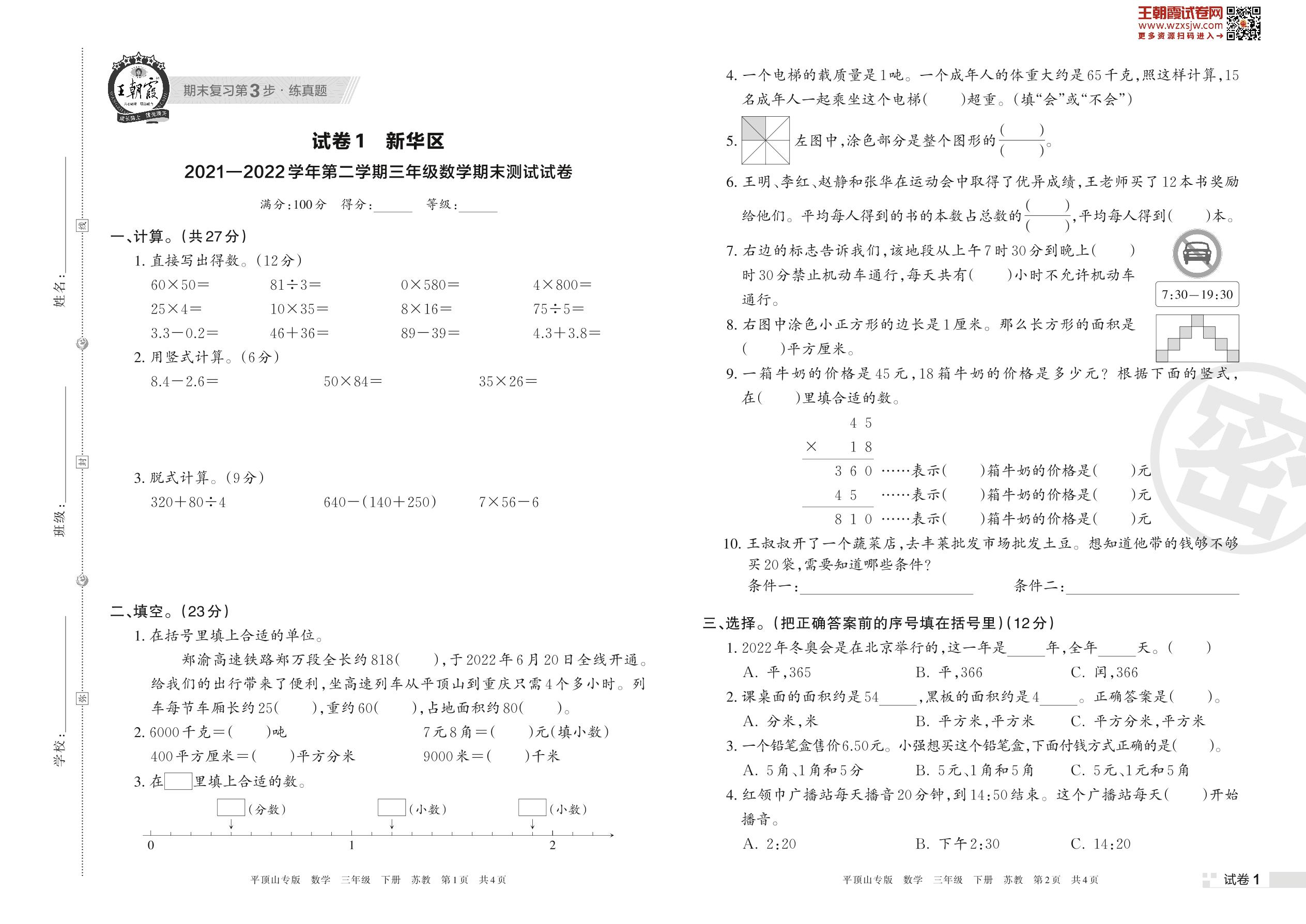 新华区2021—2022学年第二学期三年级数学期末测试试卷(苏教版)【1】