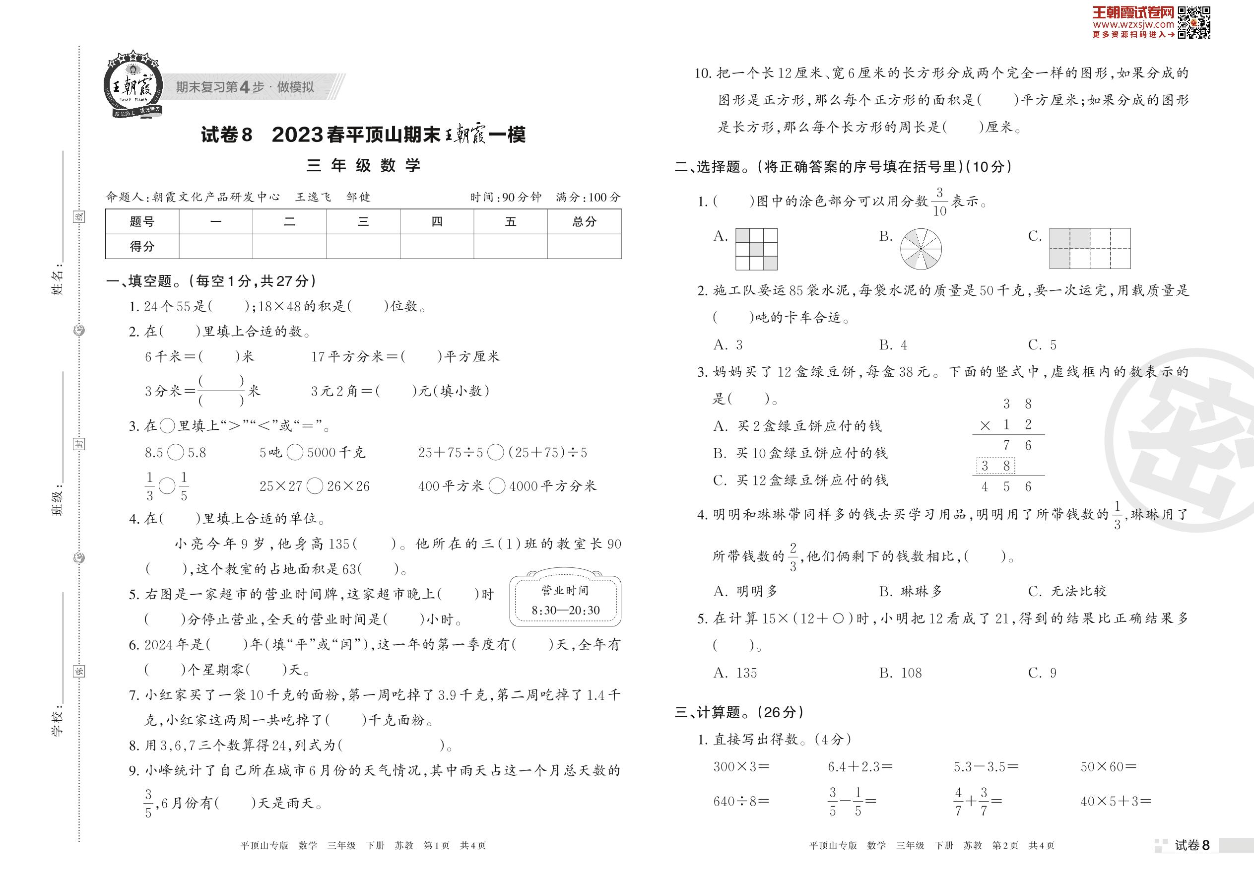 王朝霞期末模拟卷三年级下册数学(苏教版)_R230421164850664【8】