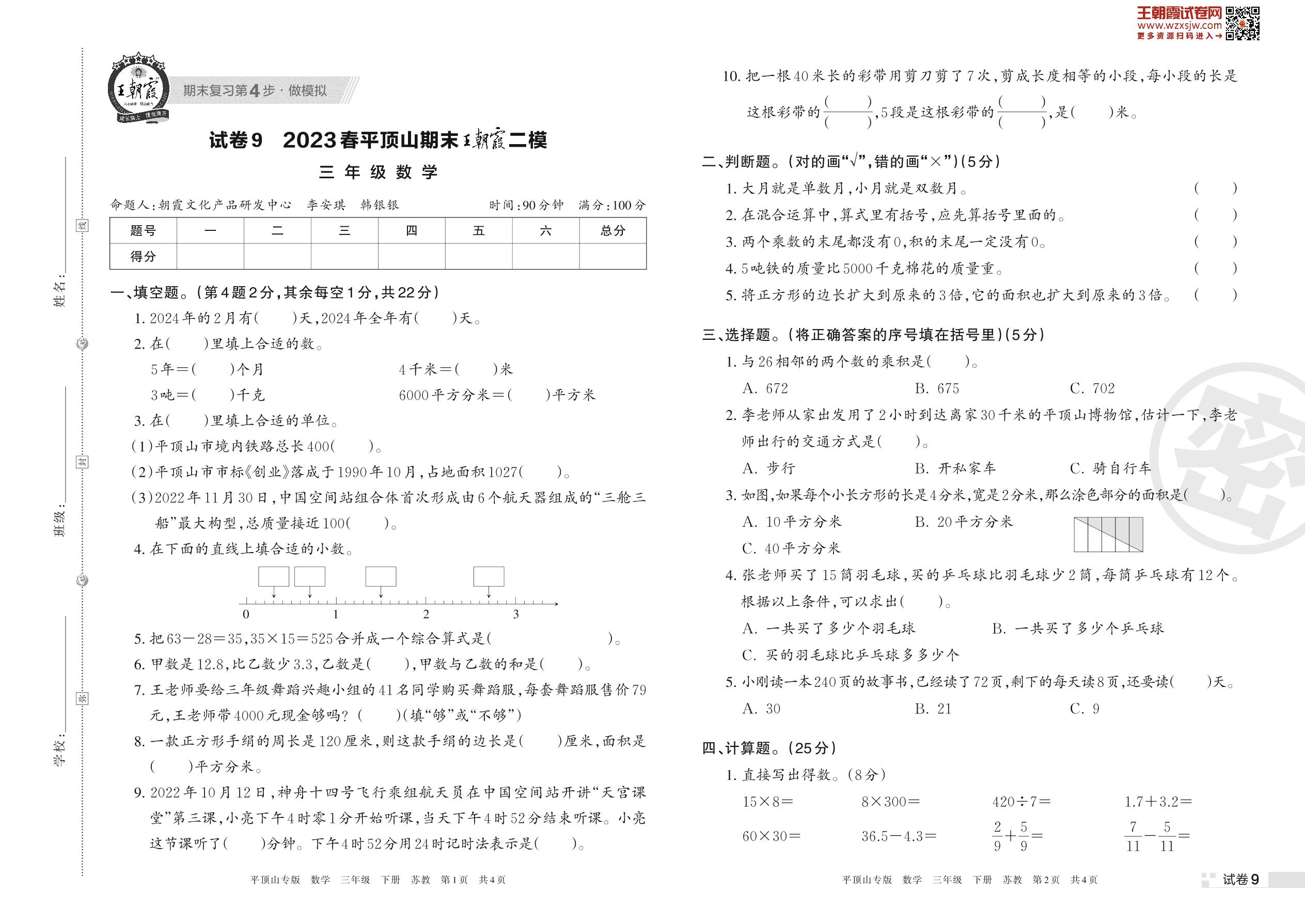 王朝霞期末模拟卷三年级下册数学(苏教版)_R230421164850097【9】