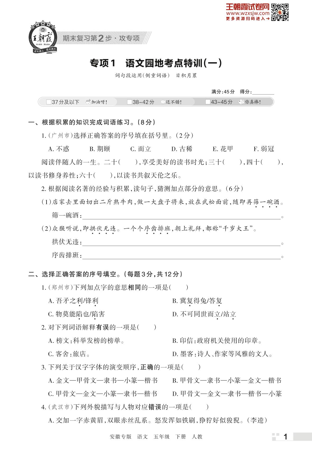 王朝霞期末专项卷——语文园地考点特训(一)五年级下册语文(人教版)_R230421164952534【1】