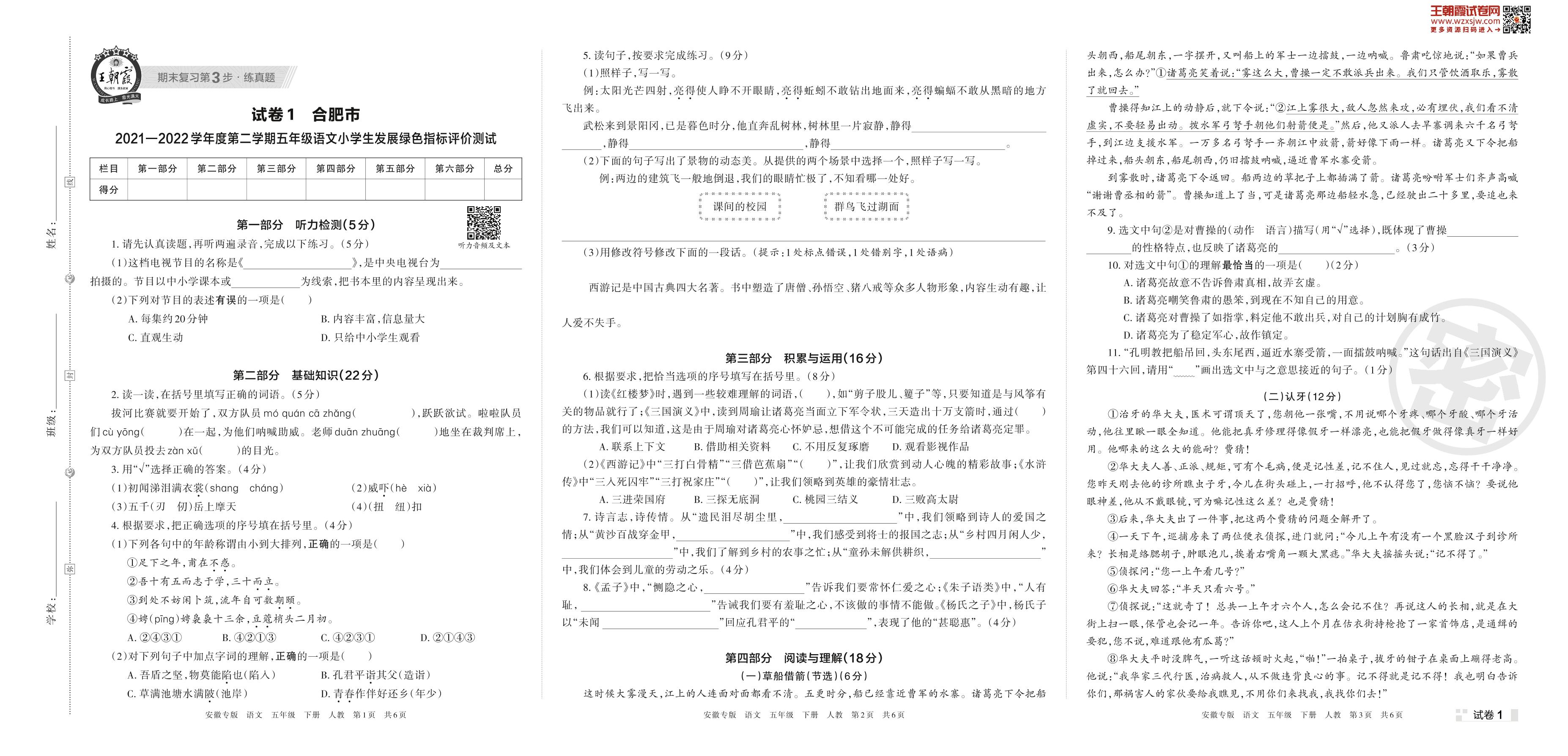 合肥市2021—2022学年度第二学期五年级语文小学生发展绿色指标评价测试(人教版)【1】