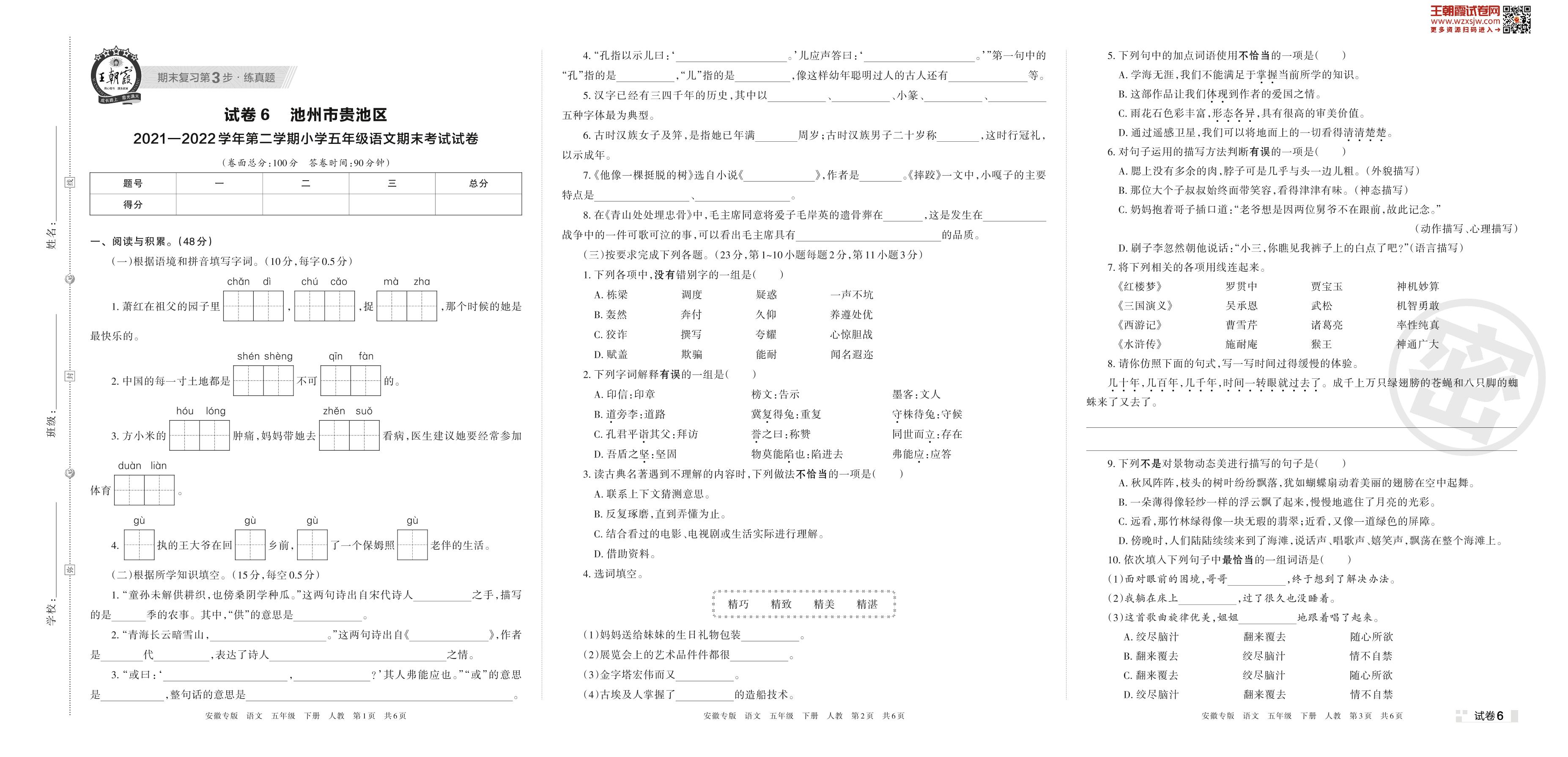 池州市贵池区2021—2022学年第二学期小学五年级语文期末考试试卷(人教版)【6】