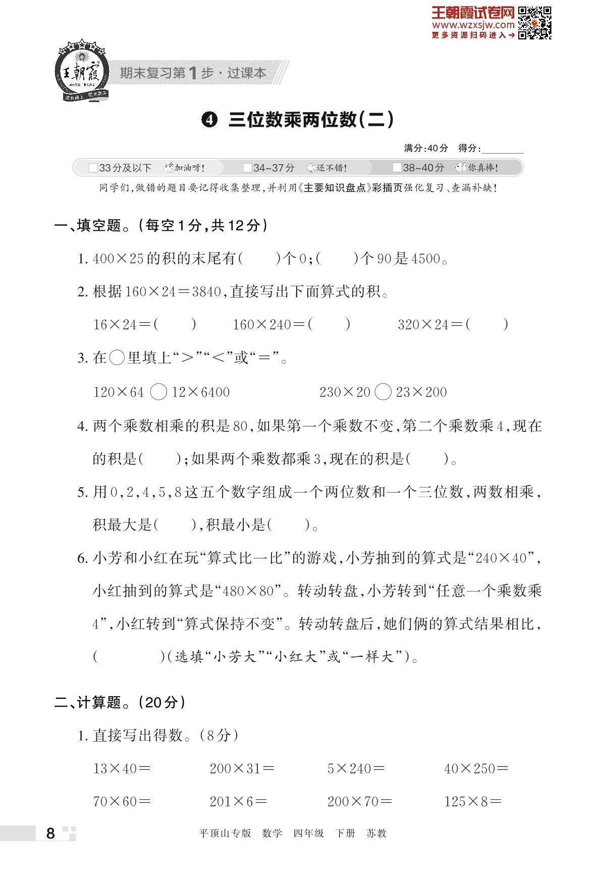 王朝霞期末过课本——4 三位数乘两位数(二)四年级下册数学(苏教版)