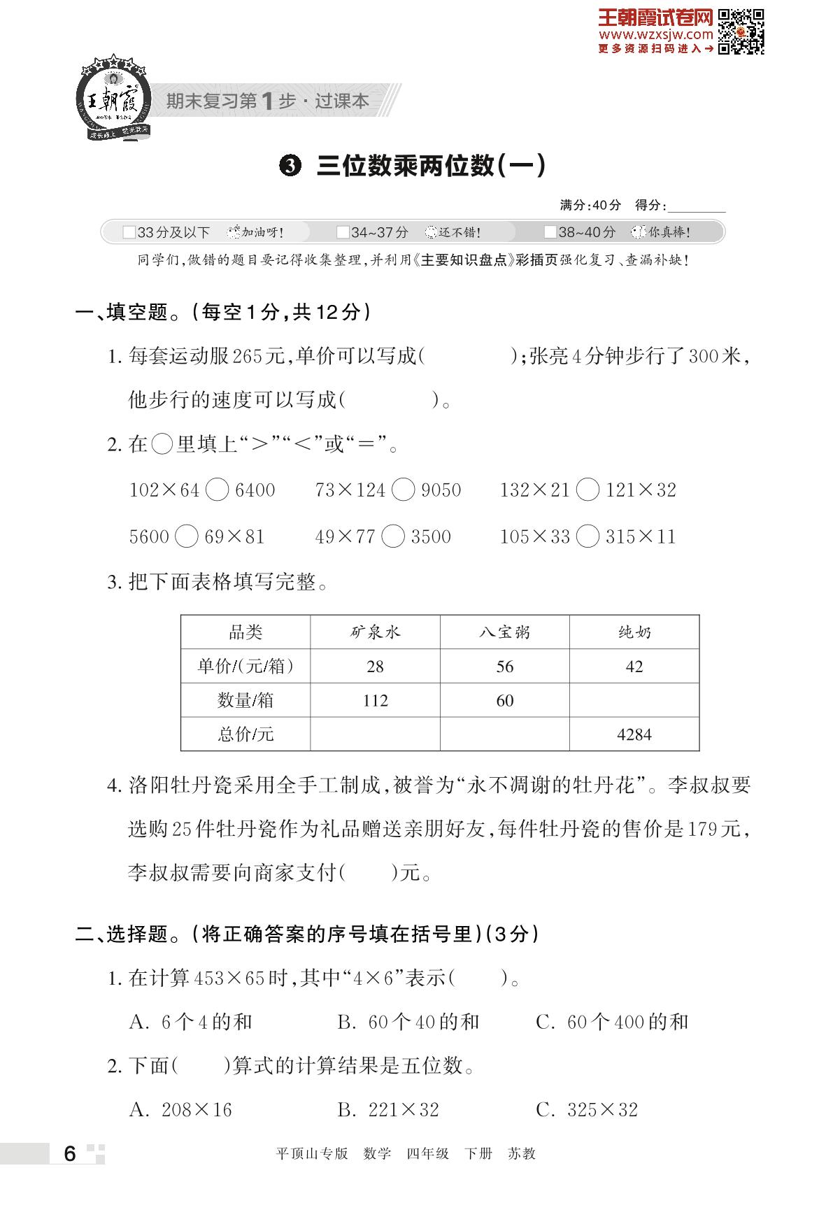 王朝霞期末过课本——3 三位数乘两位数(一)四年级下册数学(苏教版)