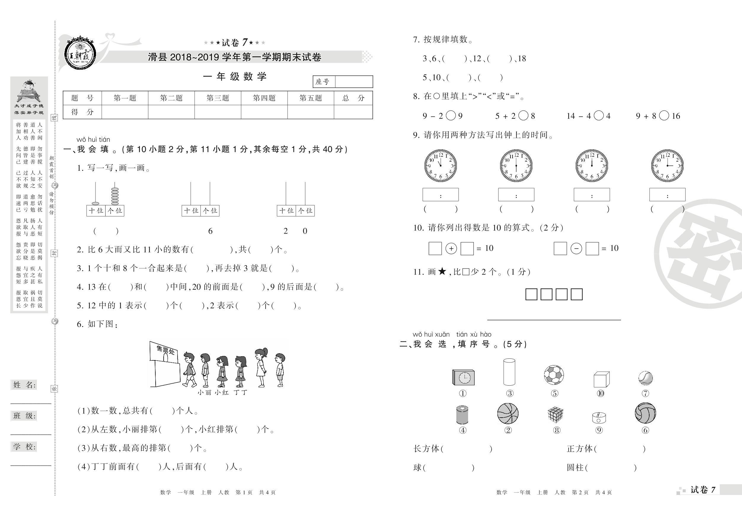 2018-2019学年第一学期安阳市滑县一年级数学试卷(人教版)【7】