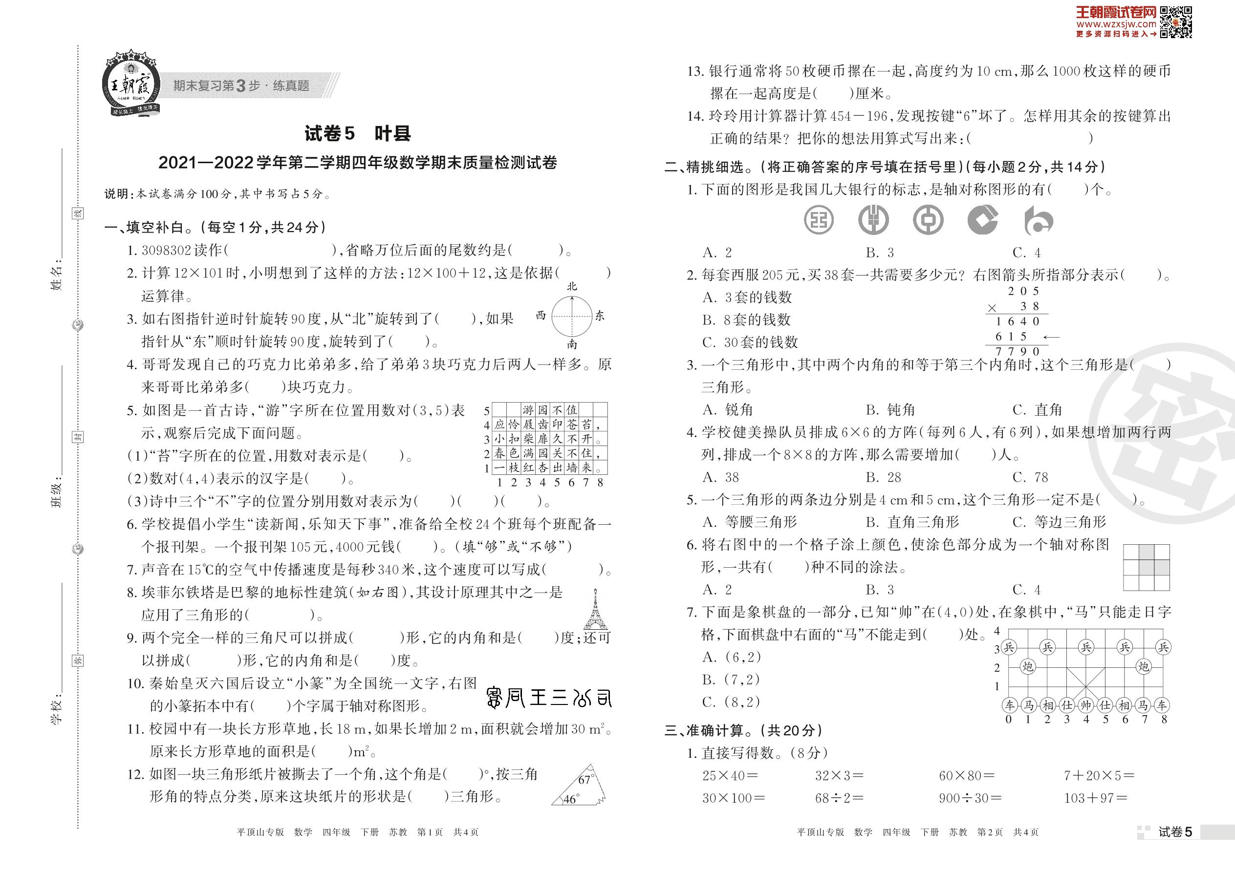 叶县2021—2022学年第二学期四年级数学期末质量检测试卷(苏教版)【5】