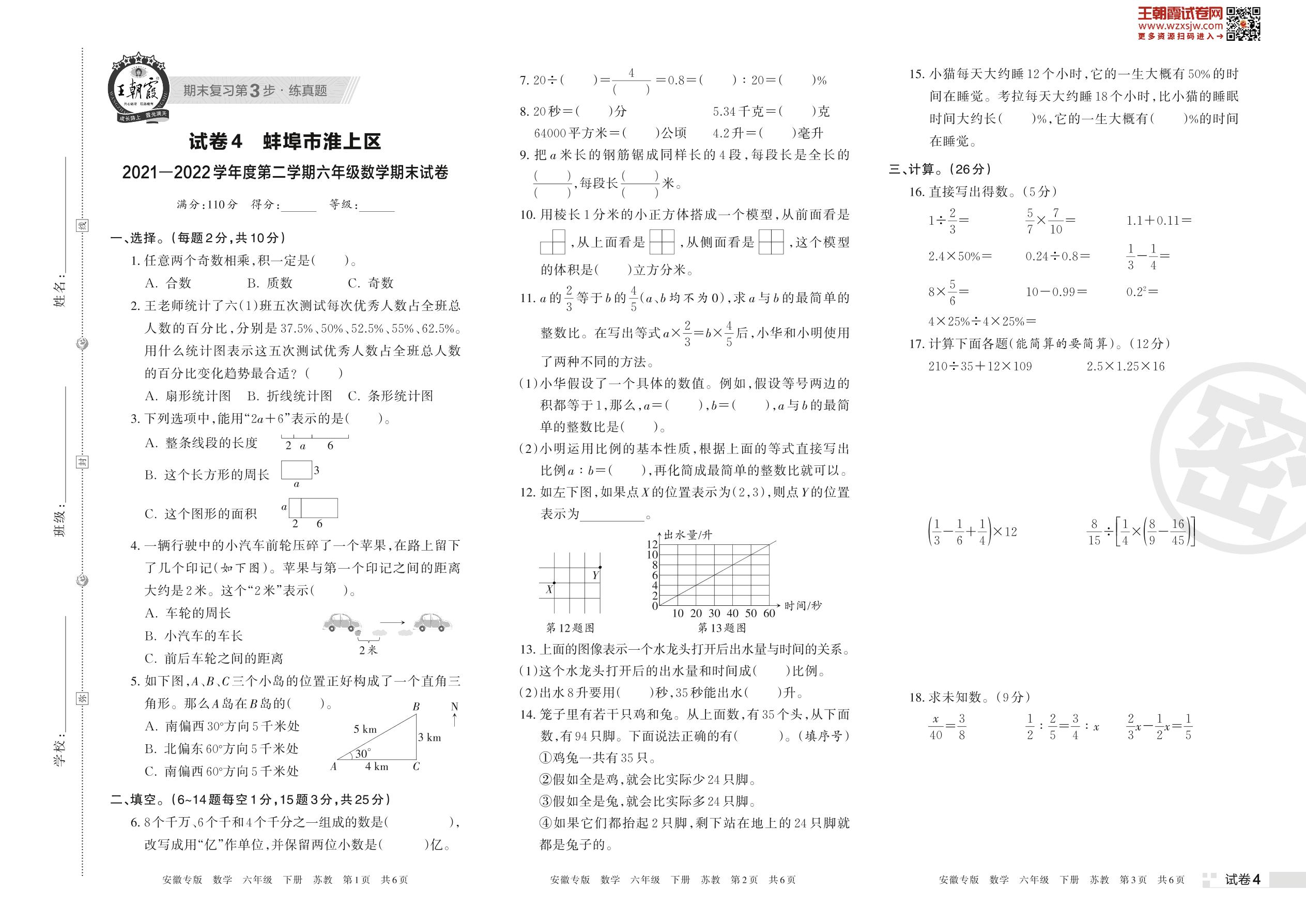 蚌埠市淮上区2021—2022学年度第二学期六年级数学期末试卷(苏教版)【4】