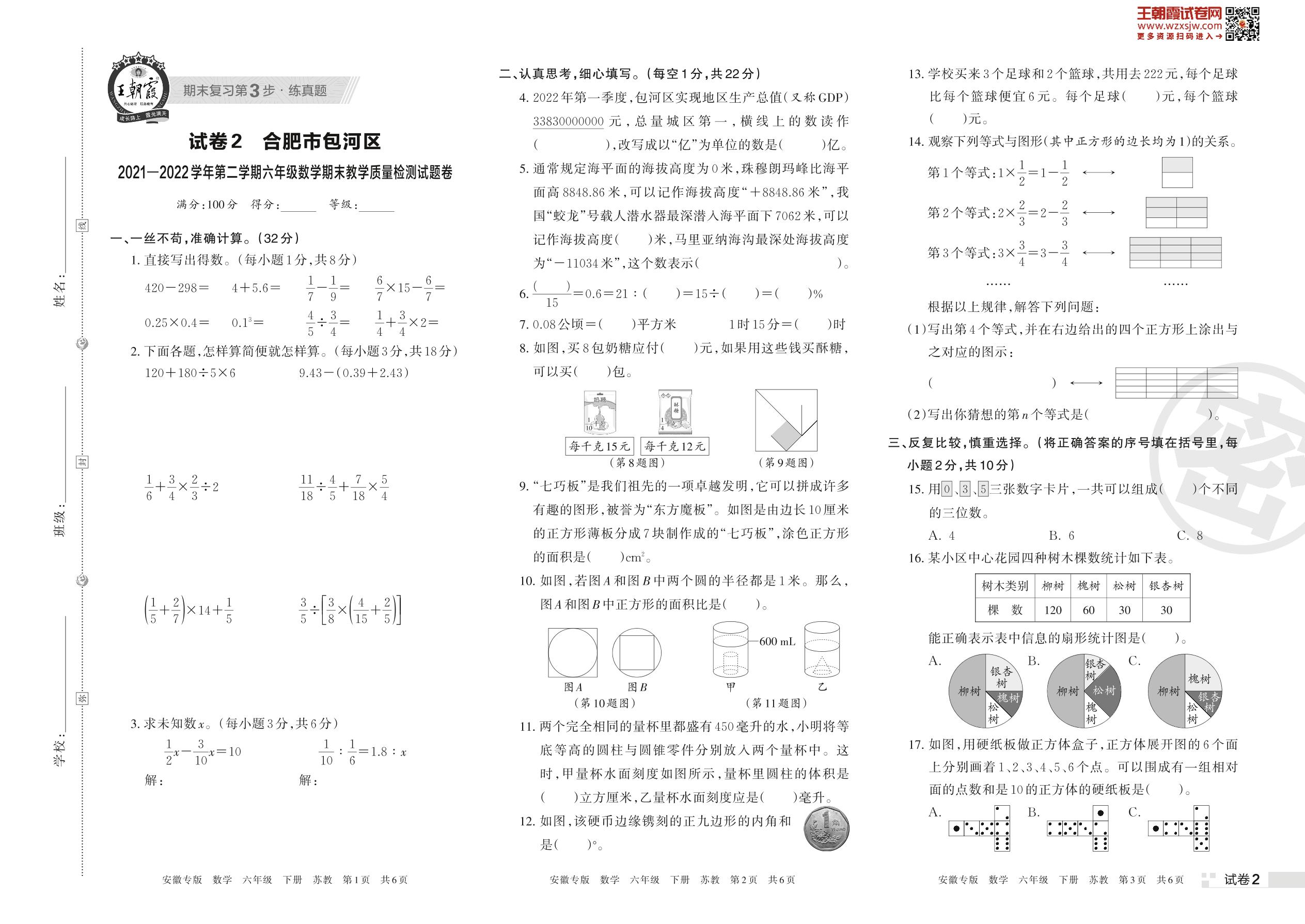 合肥市包河区2021—2022学年第二学期六年级数学期末教学质量检测试题卷(苏教版)【2】