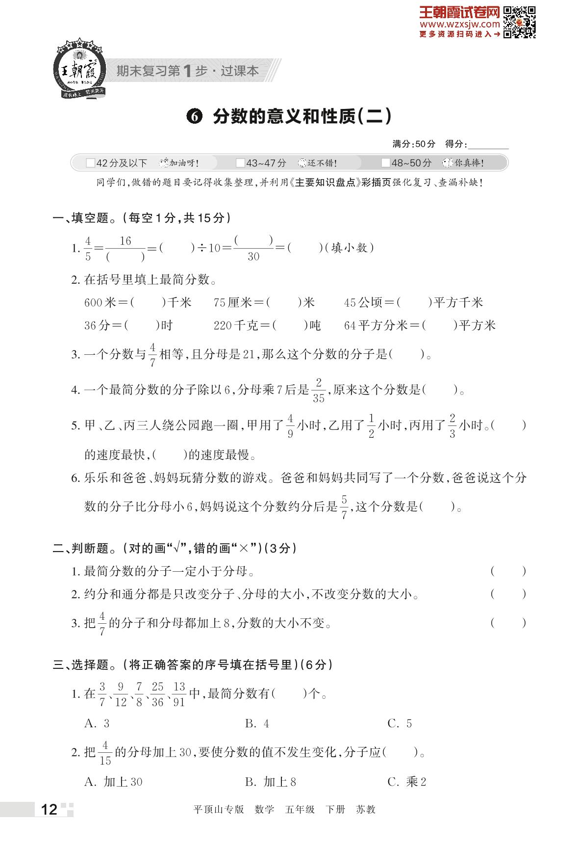 王朝霞期末过课本——6 分数的意义和性质(二)五年级下册数学(苏教版)